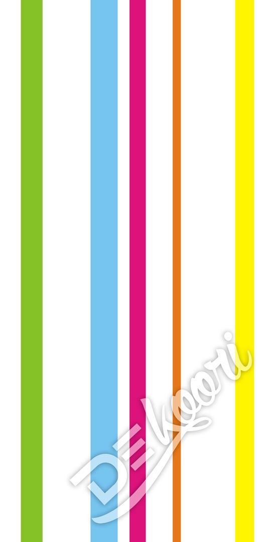 Moderní, barevná dekorativní tapeta se svislými pruhy v pěti barvách: zelené, modré, růžové, oranžové, žluté. Moderní, designový a lehký projekt.