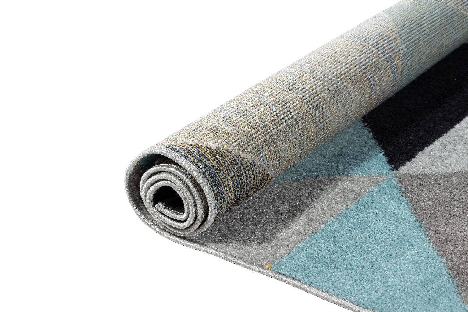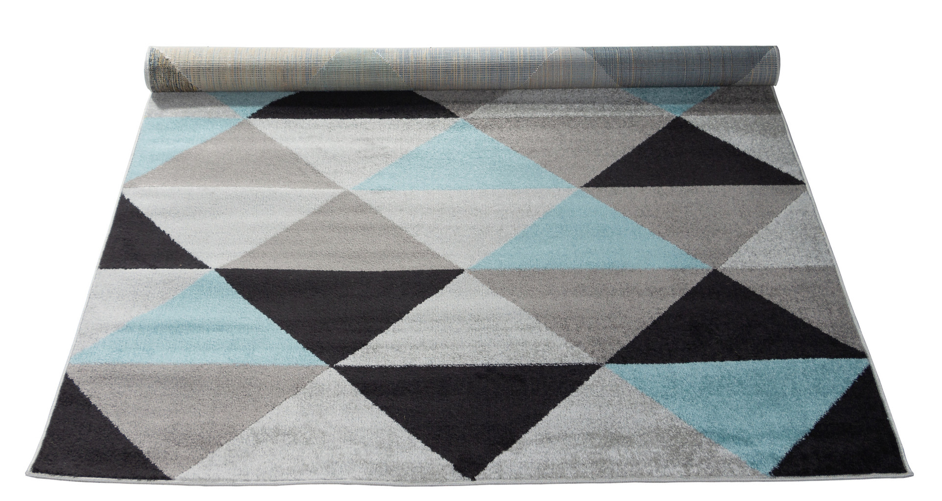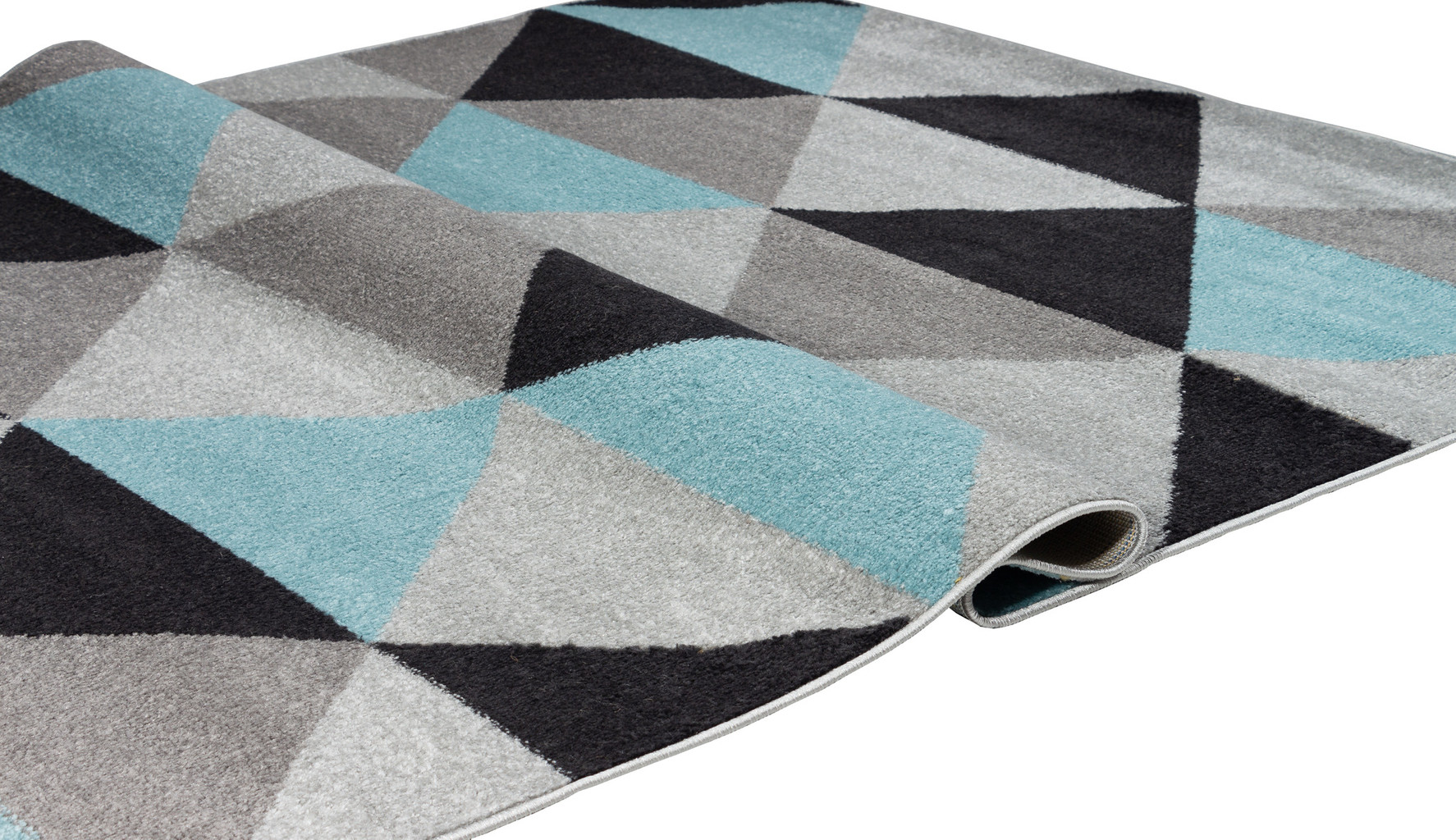 Barevný koberec do pokoje, do ložnice s modrými, šedými a černými trojúhelníky Ice Stream 08