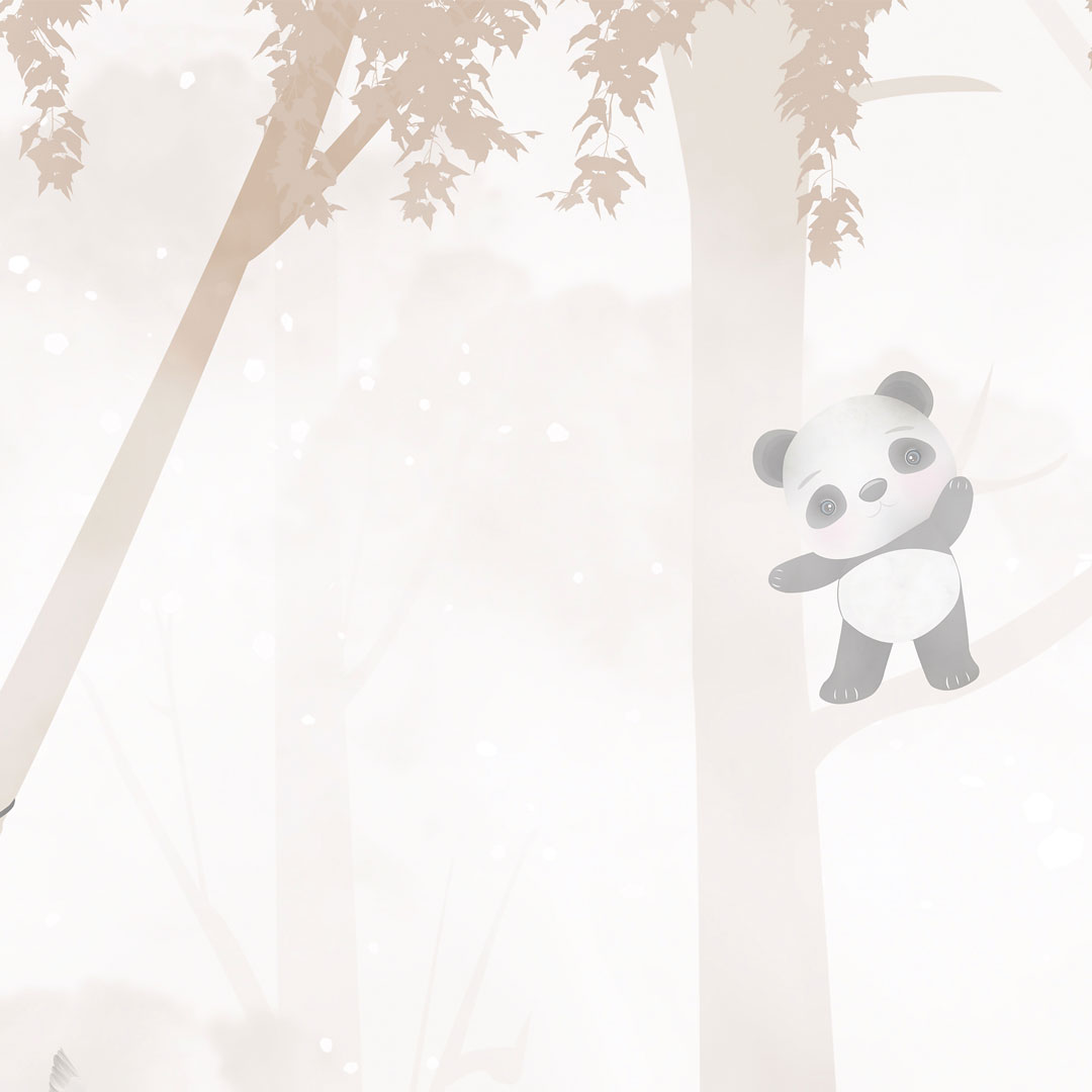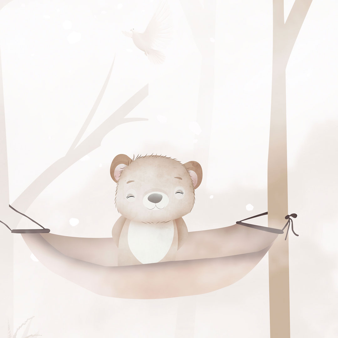Jemná pastelová dětská fototapeta, béžová a krémová tapeta LEŚNY SEN do dětského pokoje. Zvířátka v lese, žirafa, slon a medvídek, se připravují ke spánku na houpacích sítích. Jen panda si ještě pohrává 🙈. V pozadí stromy a poletující ptáci.