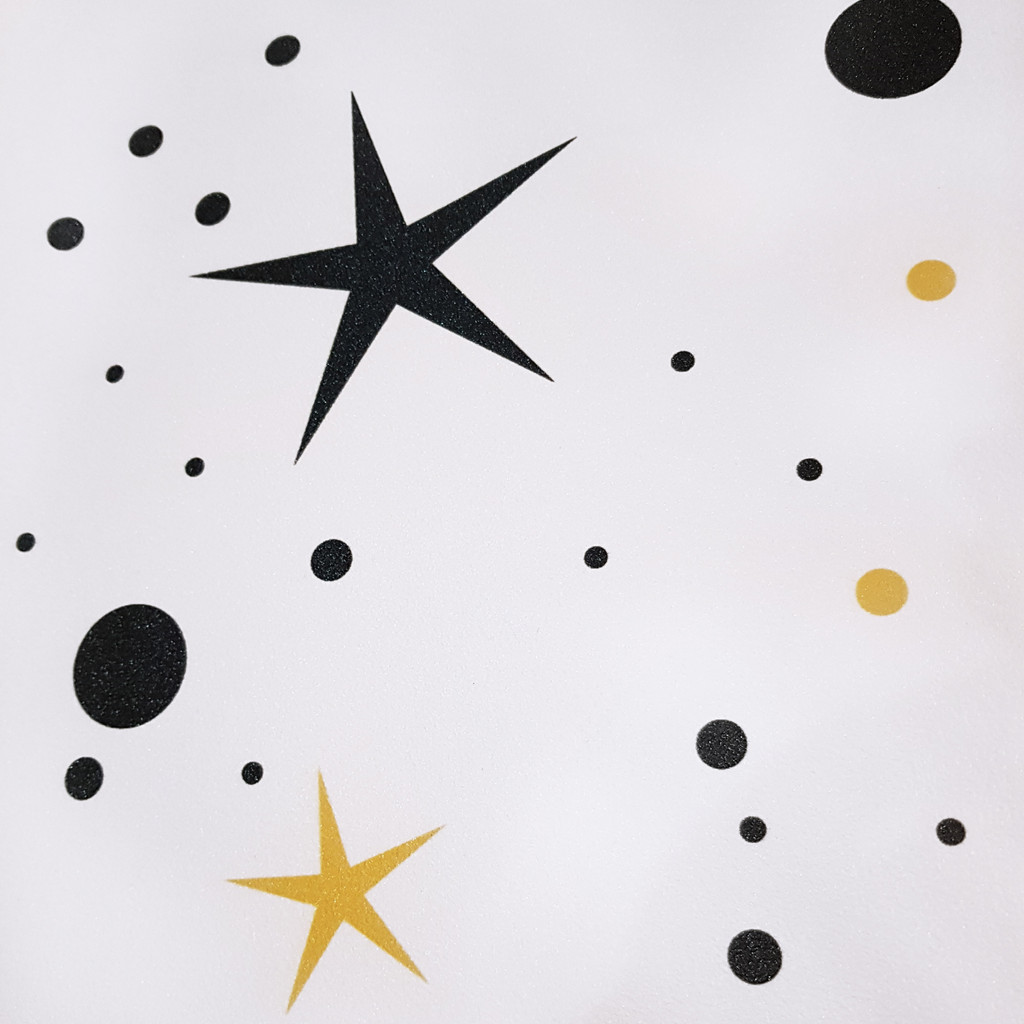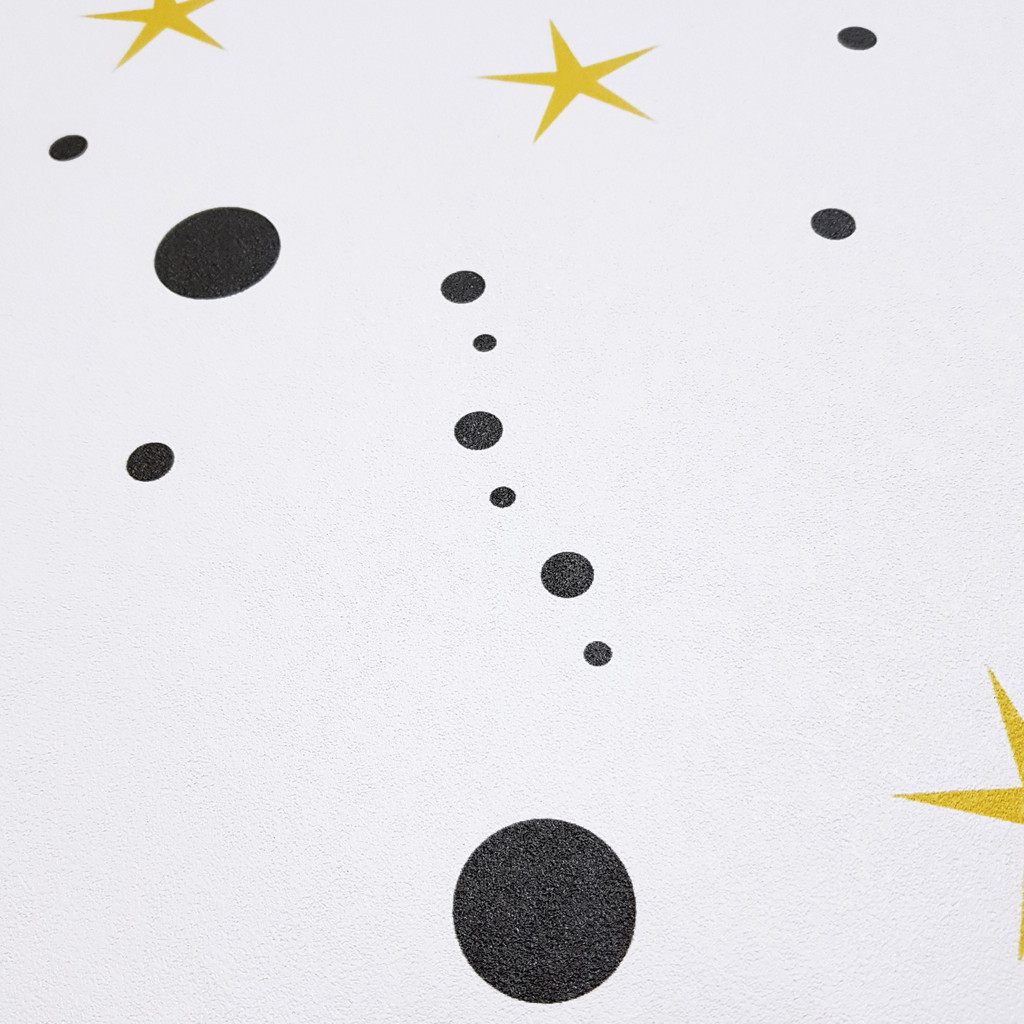 Originální bílá tapeta na zeď se vzorem, který tvoří černé a hořčicové hvězdy a puntíky. Tapeta je omyvatelná a lze ji použít v jakékoliv místnosti. Určitě se bude hodit do dětského pokoje nebo do interiéru pro mládež.