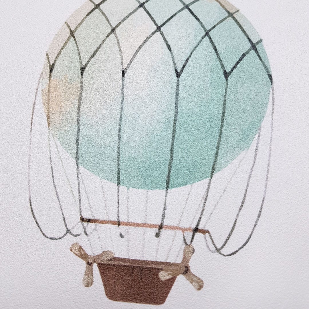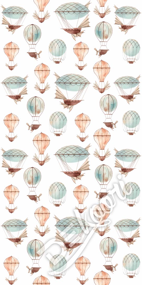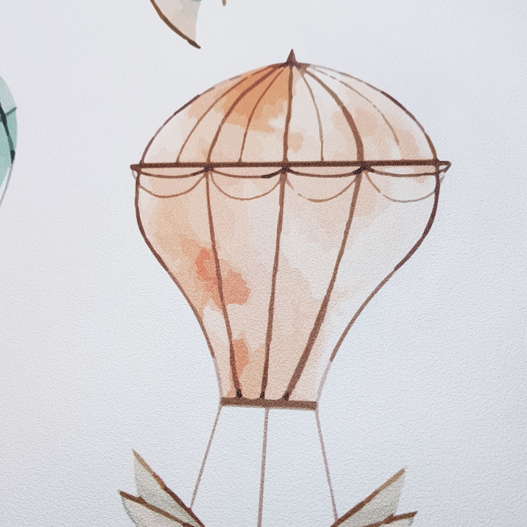 Bílá dětská tapeta na zeď s pastelovými broskvovými a modrými létajícími stroji (balónky a lodě) přenese vaše děti do pohádkové země dobrodružství!
