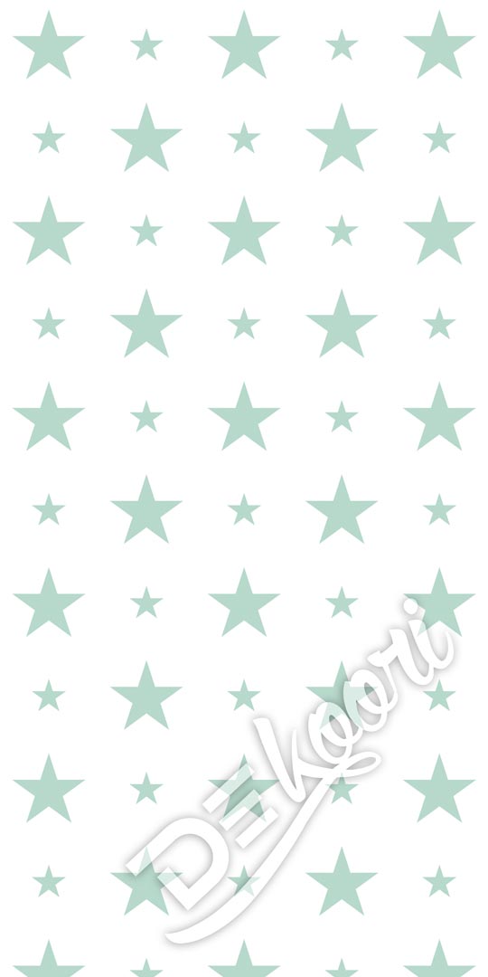 Dekorativní, světlá, bílá tapeta s mátovými hvězdami ve dvou velikostech: 15 a 7 cm.