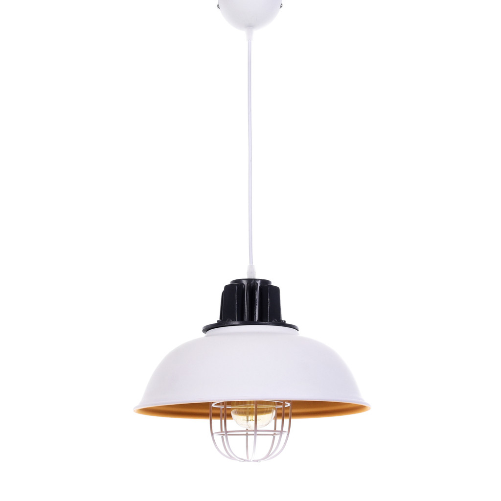 Lustr FUKO ve stylu retro, loftovém, v bílé barvě s černými a okrovými prvky. Je zavěšená na nastavitelném kabelu, vyrobená z kovu. Bude vypadat skvěle v obývacím pokoji, kuchyni nebo prostoru.