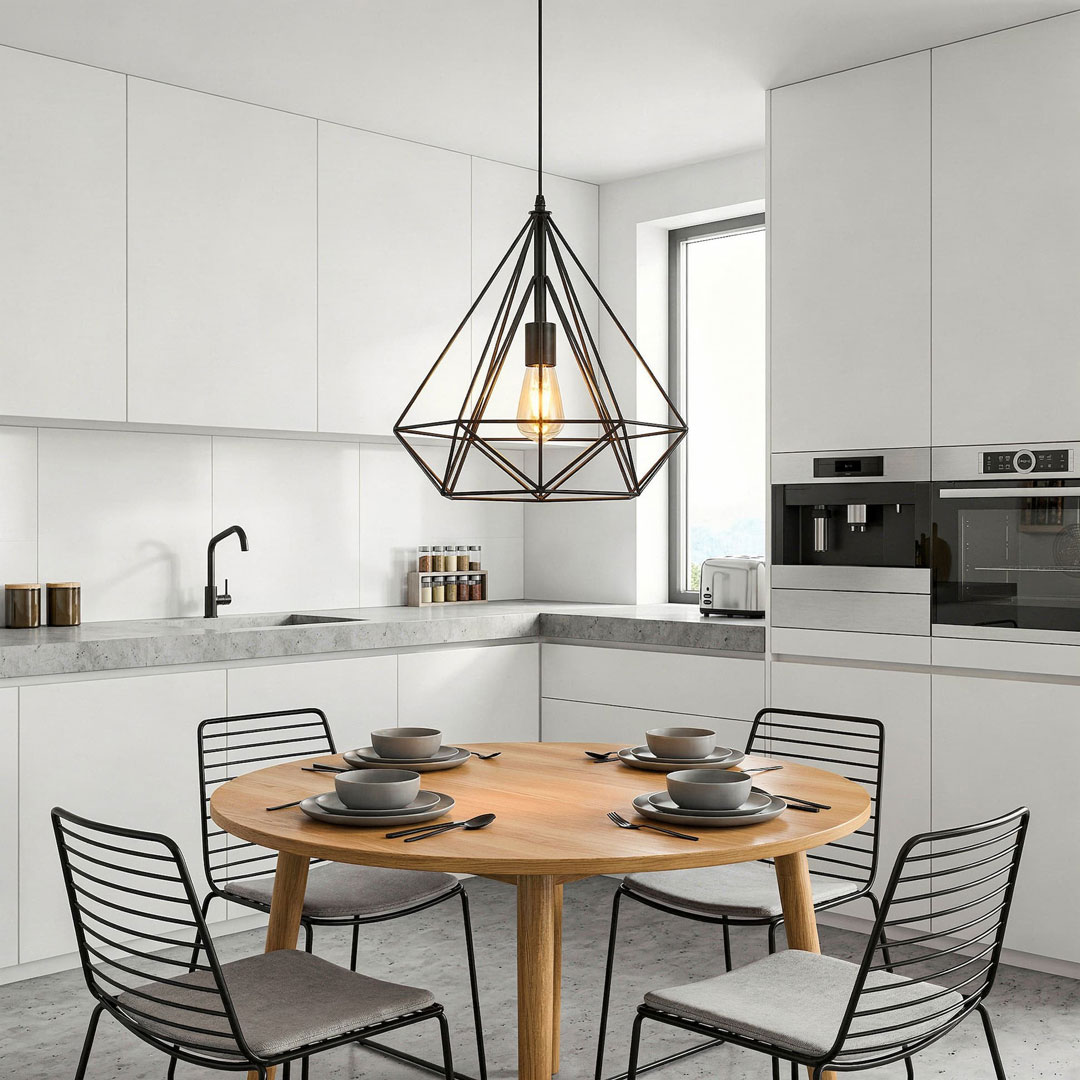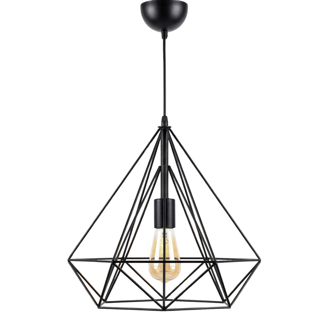 Minimalistická, závěsná černá drátová lampa ve tvaru diamantu odpovídající stylu industriálnímu, loftovému a také skandinávskému. Rám stínidla je vyroben z kovového drátu a stínítko z bílé tkaniny.