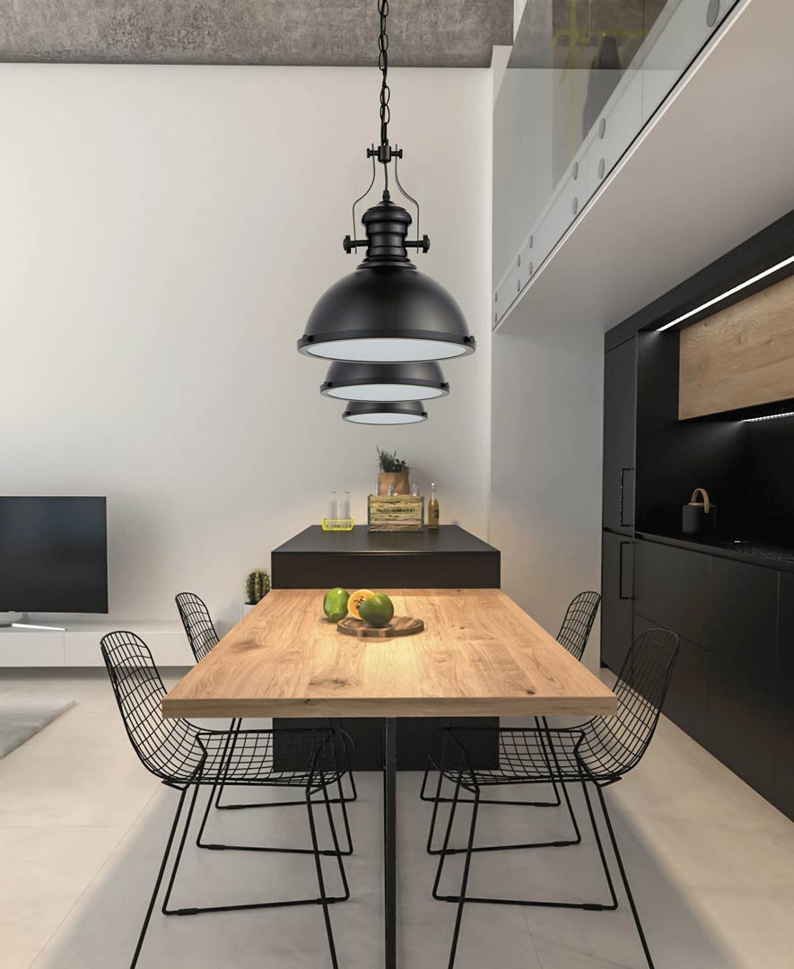 Závěsná, černá průmyslová loftová lampa ELIGIO vyrobená z kovu a skla. Vhodná pro interiéry v módním, industriálním retro stylu. Provedení v elegantní matně černé barvě. Svítidlo je zavěšené na řetízku.
