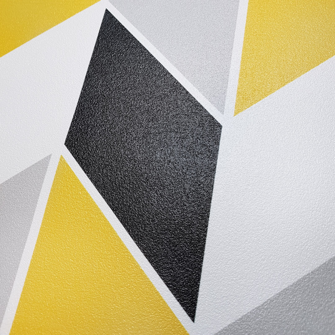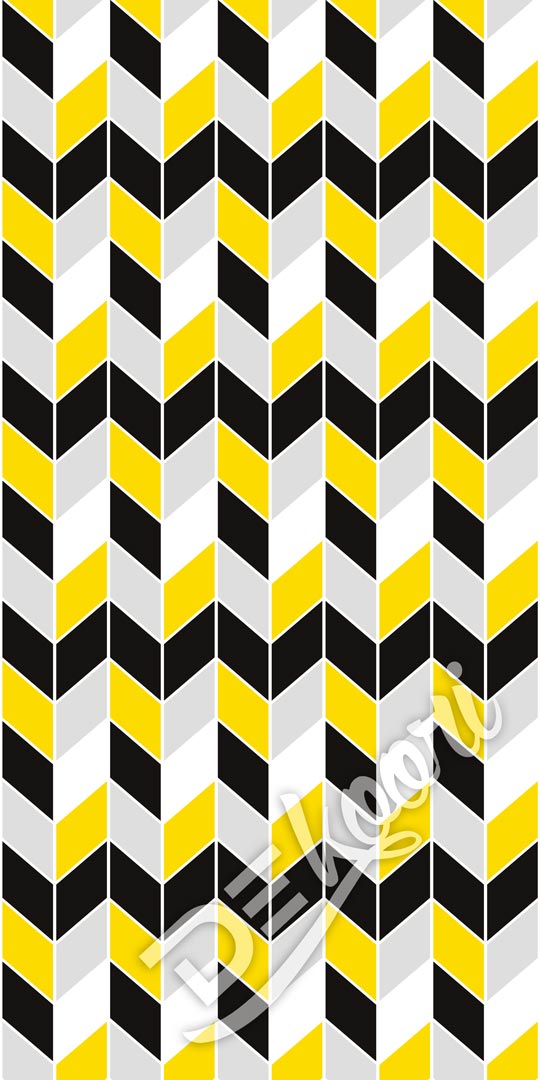 Moderní, geometrická tapeta s designovým vzorem chevron, cik cak, v moderních barvách: černé, šedé, žluté a bílé. Hodí se obzvláště ke skandinávskému stylu.