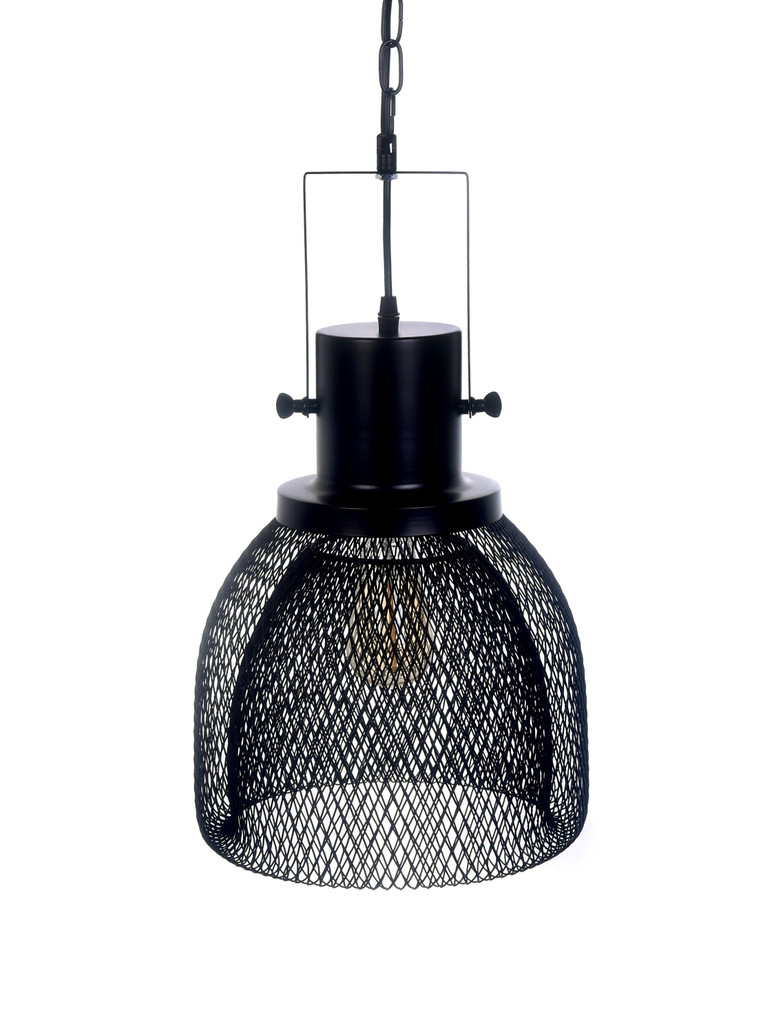 Průmyslová závěsná lampa FRATTON na řetízku s polokulatým černým stínidlem z kovové síťoviny. Lampa je v moderním, industriálním stylu. Bude vypadat skvěle v kuchyni, jídelně, chodbě a v prostorách.