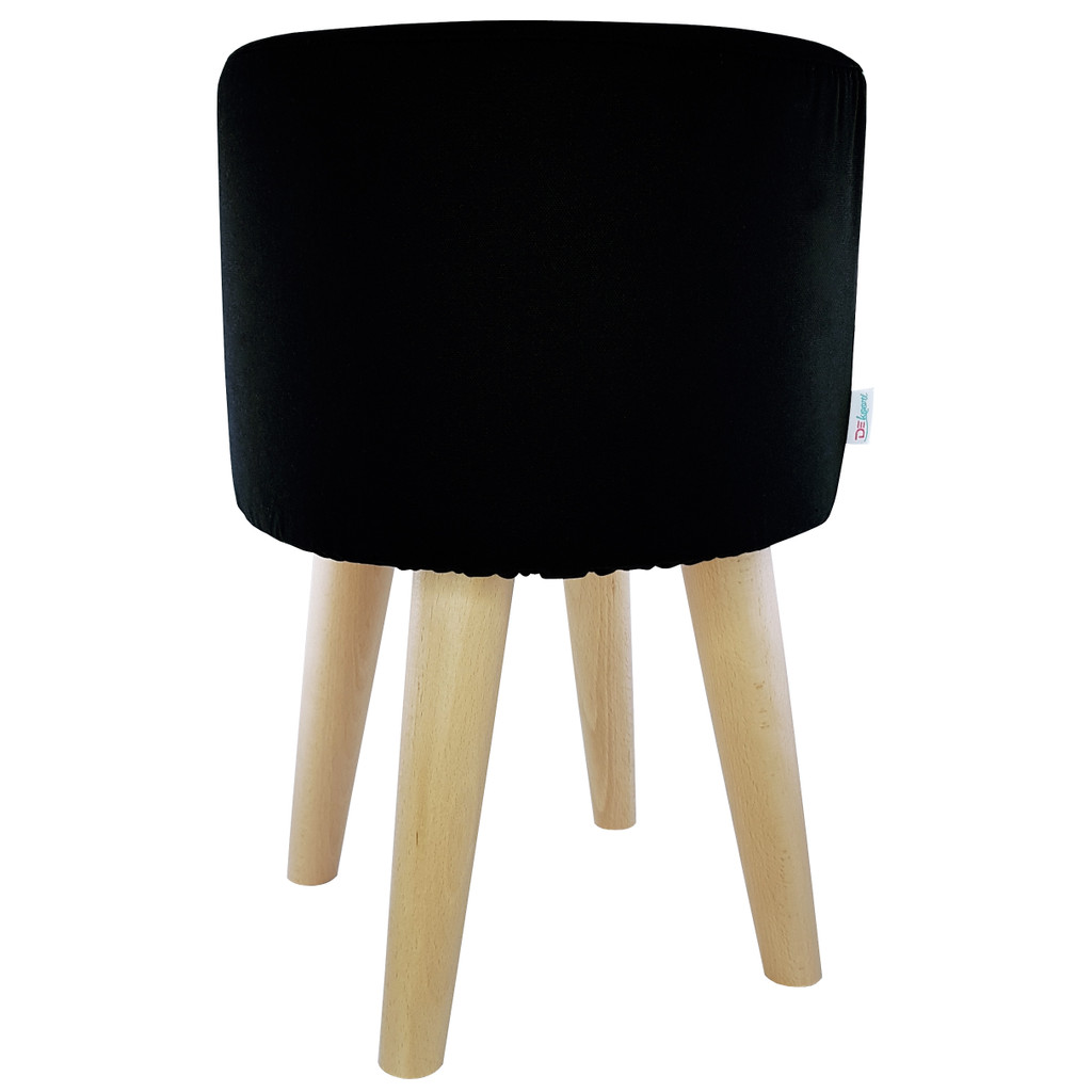 Elegantní černý pouf, sedací stolička. Má dřevěné nohy, pohodlné kulaté sedadlo a odnímatelný, jednobarevný potah v černé barvě. Hodí se do obývacího pokoje, ložnice nebo jiných místností. Můžete si vybrat stoličku nízkou nebo vysokou, nožkami s přírodními nebo bílými.