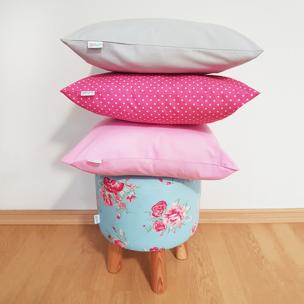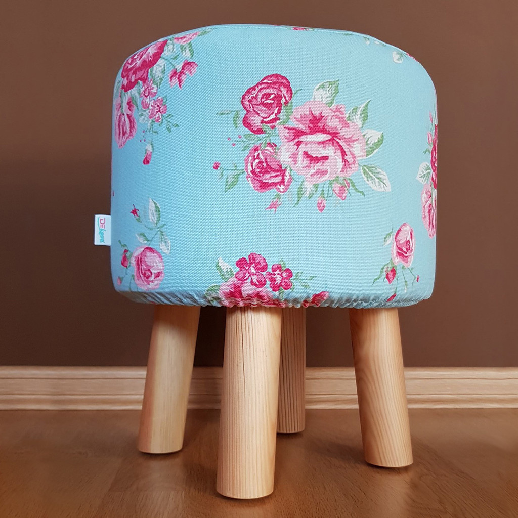 Krásný dekorativní taburet, ozdobný pouf ve stylu glamour s pohodlným sedákem a odnímatelnym bavlněným potahem s růžovými růžemi na světle modrém pozadí. Na výběr je stolička nízká nebo vysoká.