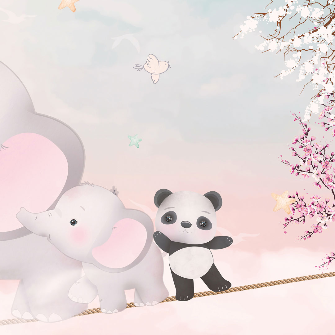 Roztomilá dětská tapeta - procházka po laně. Naše zvířátka: žirafa, panda, medvěd, slon předvádějí cirkusové triky v oblacích na modré obloze. Scénu doplňují třešňové květy, květiny, hvězdy, ptáci a motýli. Byly použity pastelové odstíny modré, růžové a lososové barvy.