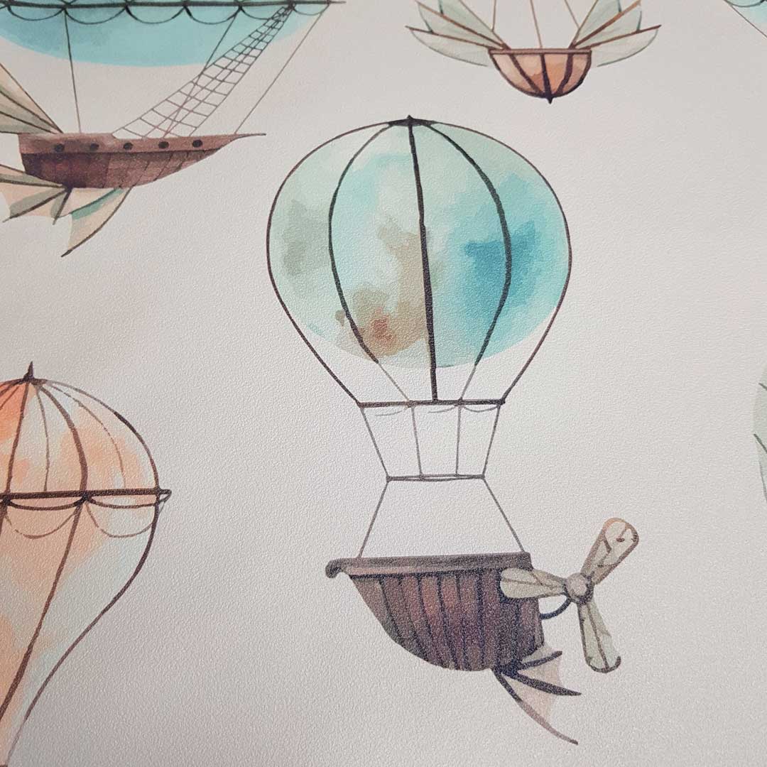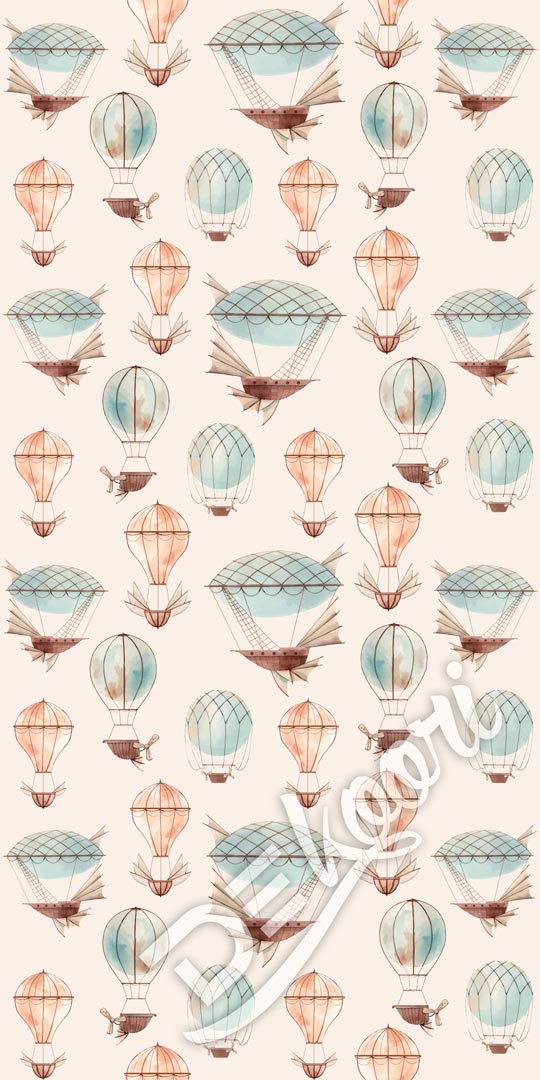 Dekorativní béžová tapeta s broskvovými a blankytnými létajícími stroji (balóny a vzducholodě), kterými se necháte unést!