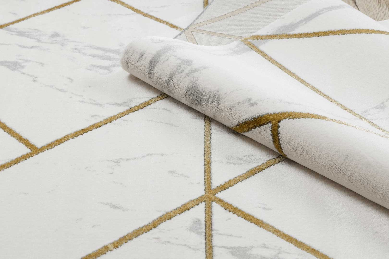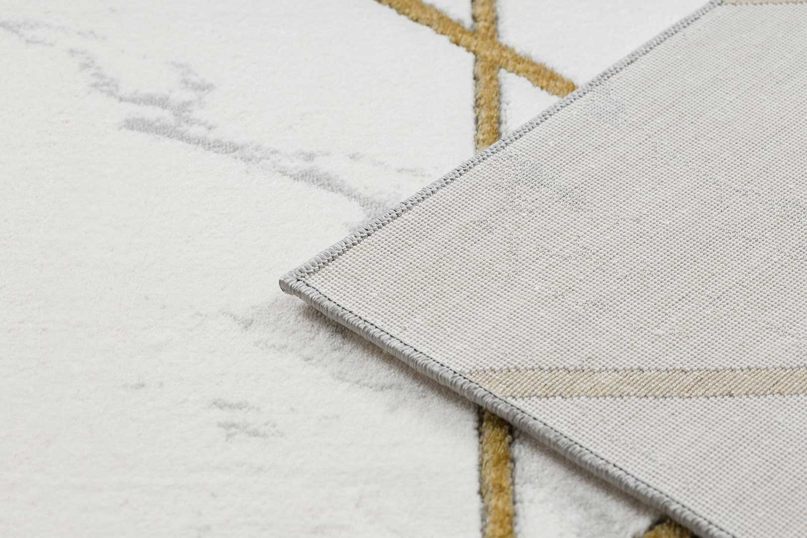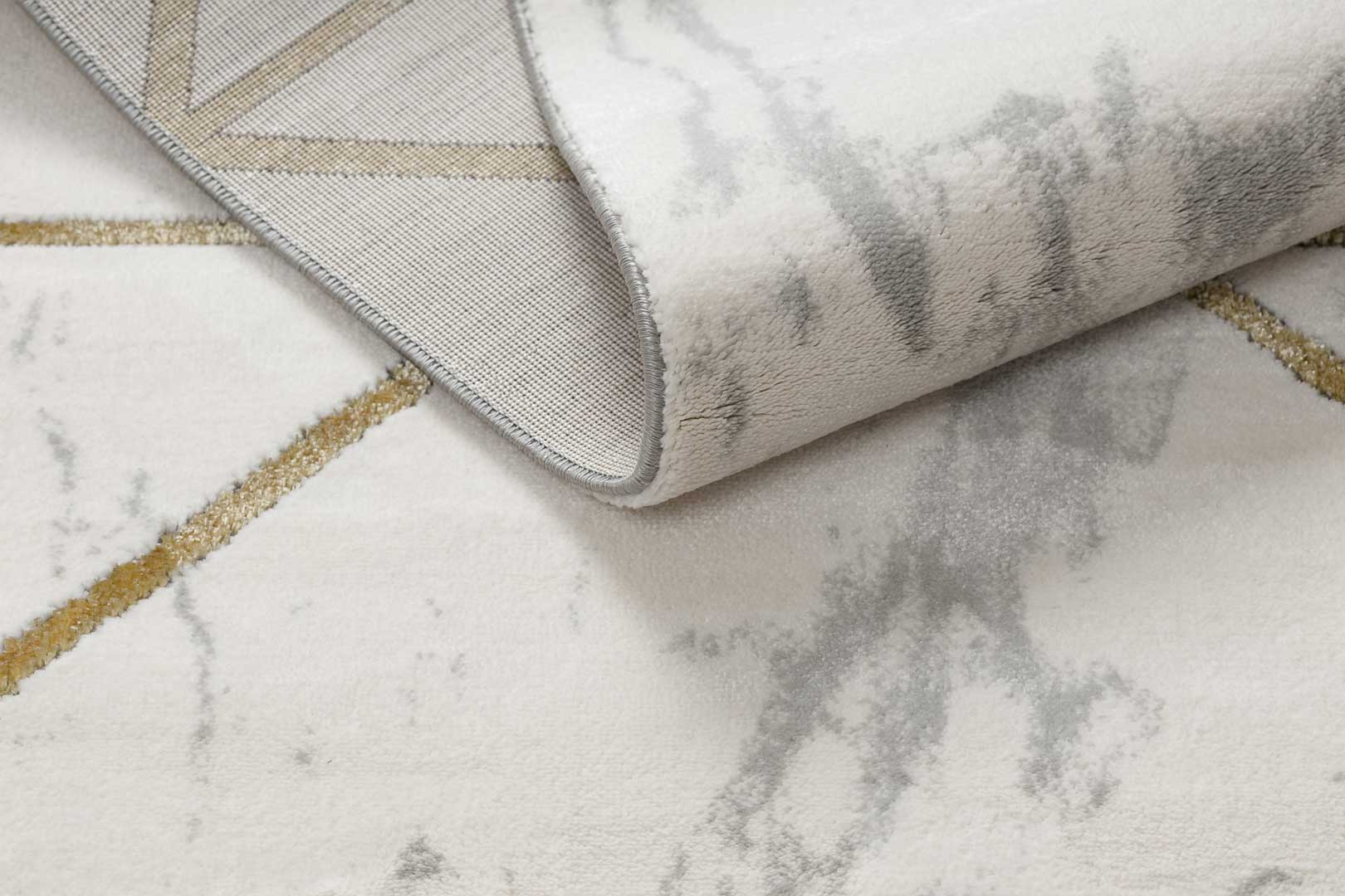 Elegantní koberec se zlatým geometrickým vzorem a mramorovým motivem do obývacího pokoje