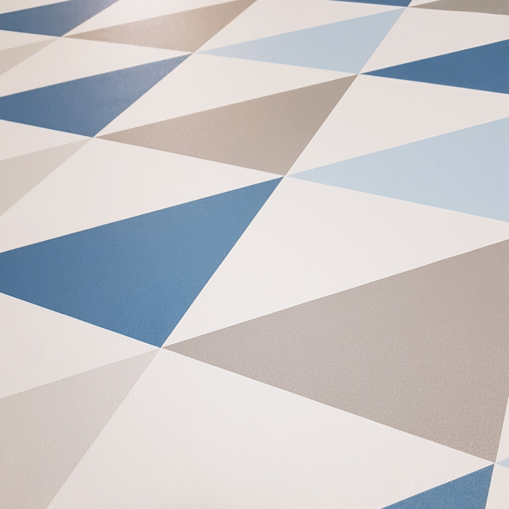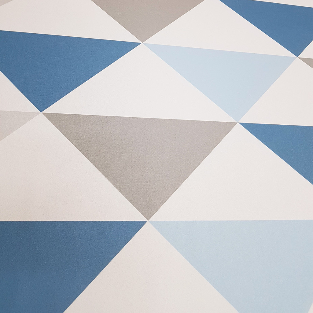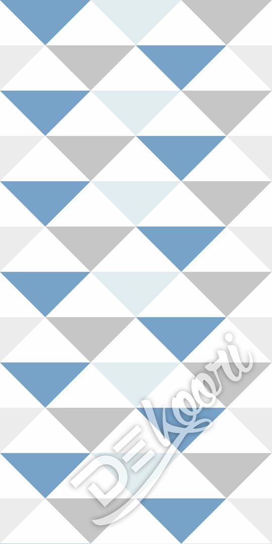 Moderní tapeta s trojúhelníky šířky 33 cm v bílé, šedé a kouřově modré barvě.