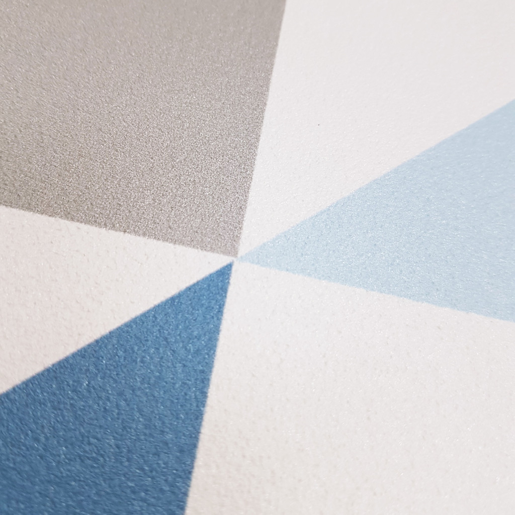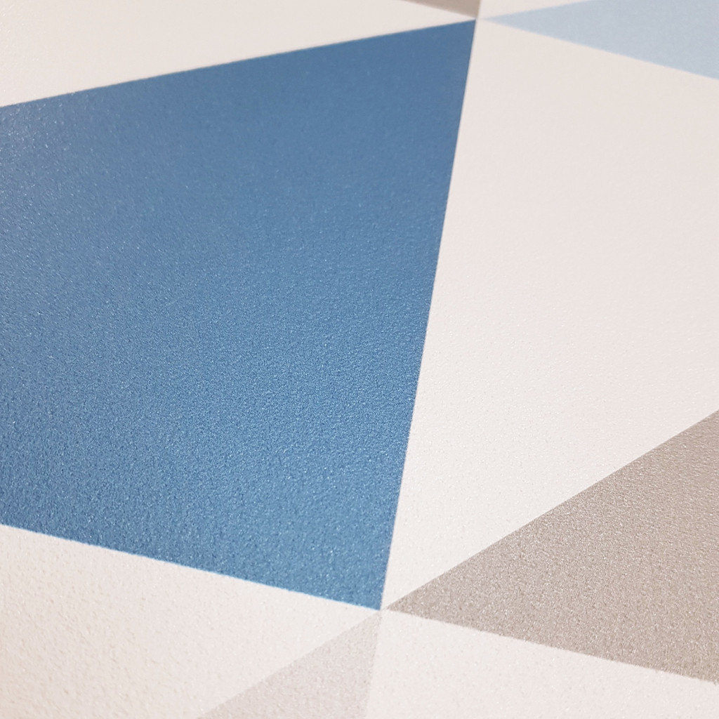 Geometrická abstraktní bílo-šedo-modrá tapeta s trojúhelníky 33 cm