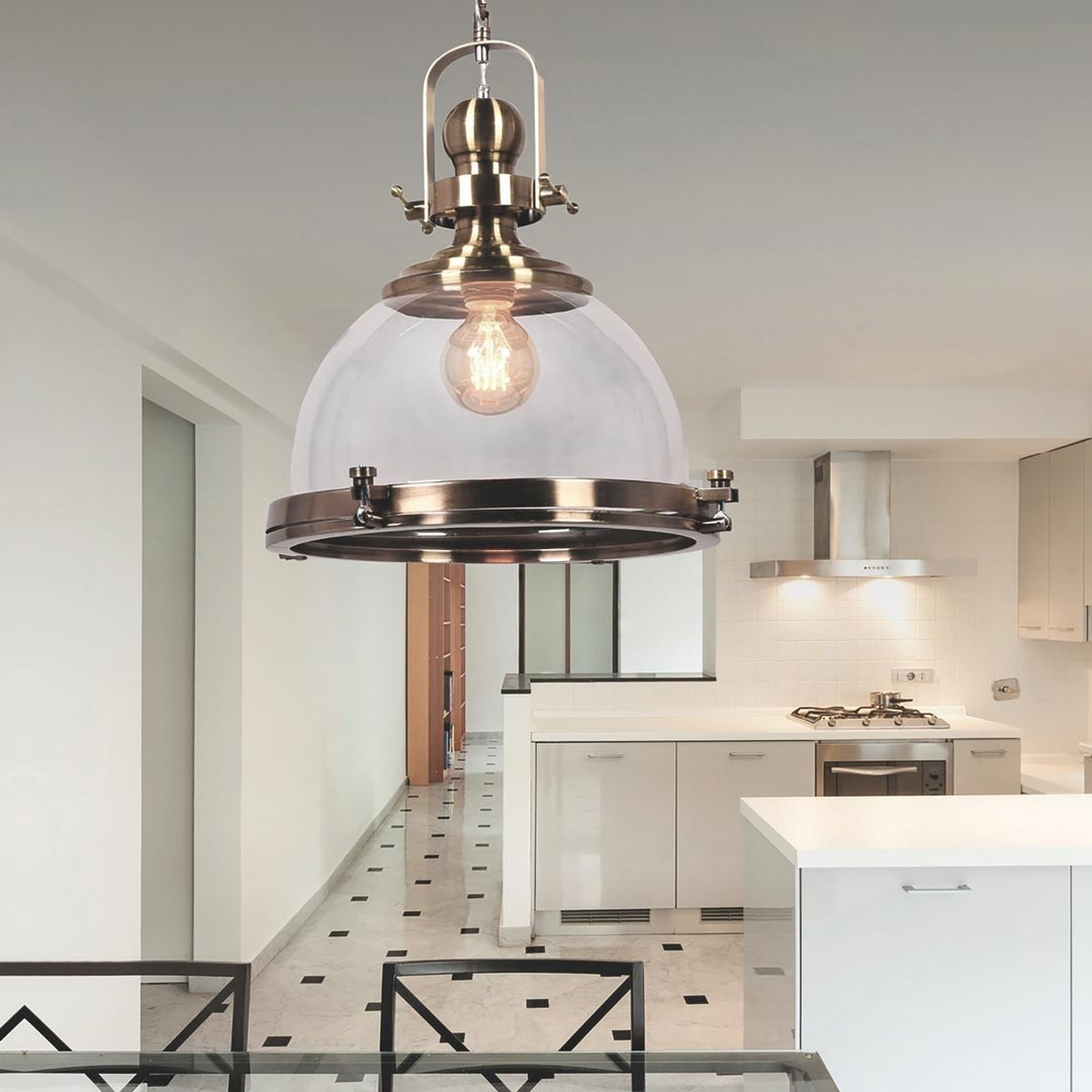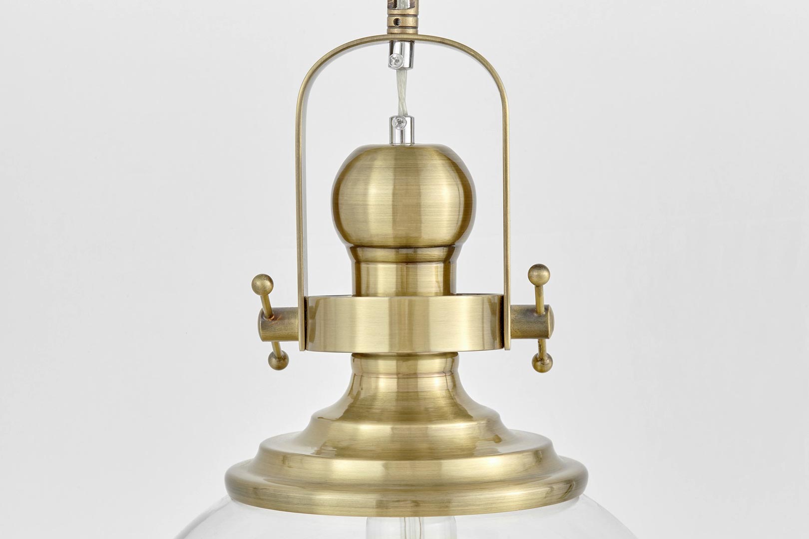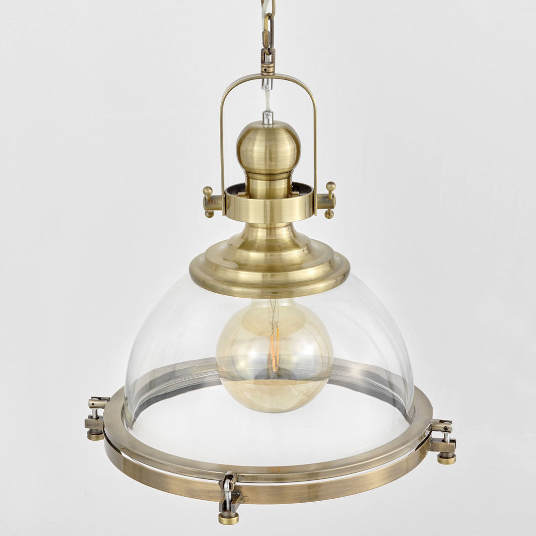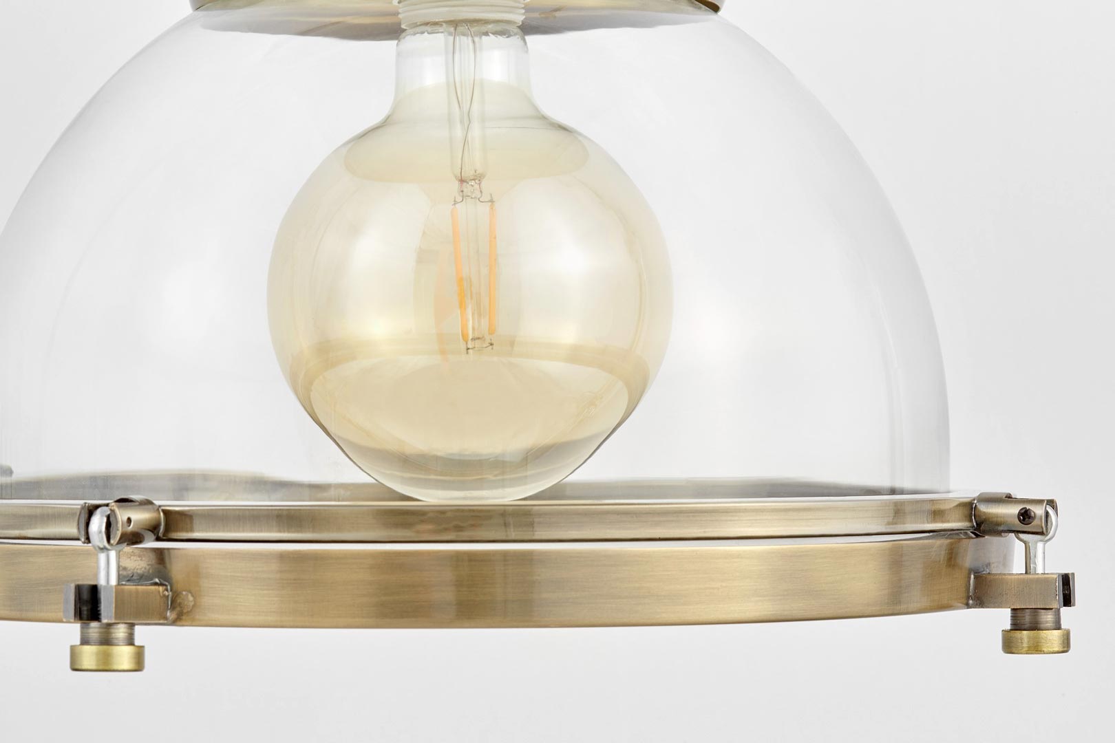 Industriální závěsná lampa na řetězu v loftovém stylu, které se vyznačuje průmyslovým designem. Lampa je vyrobena ze skla a kovu v mosazném odstínu.