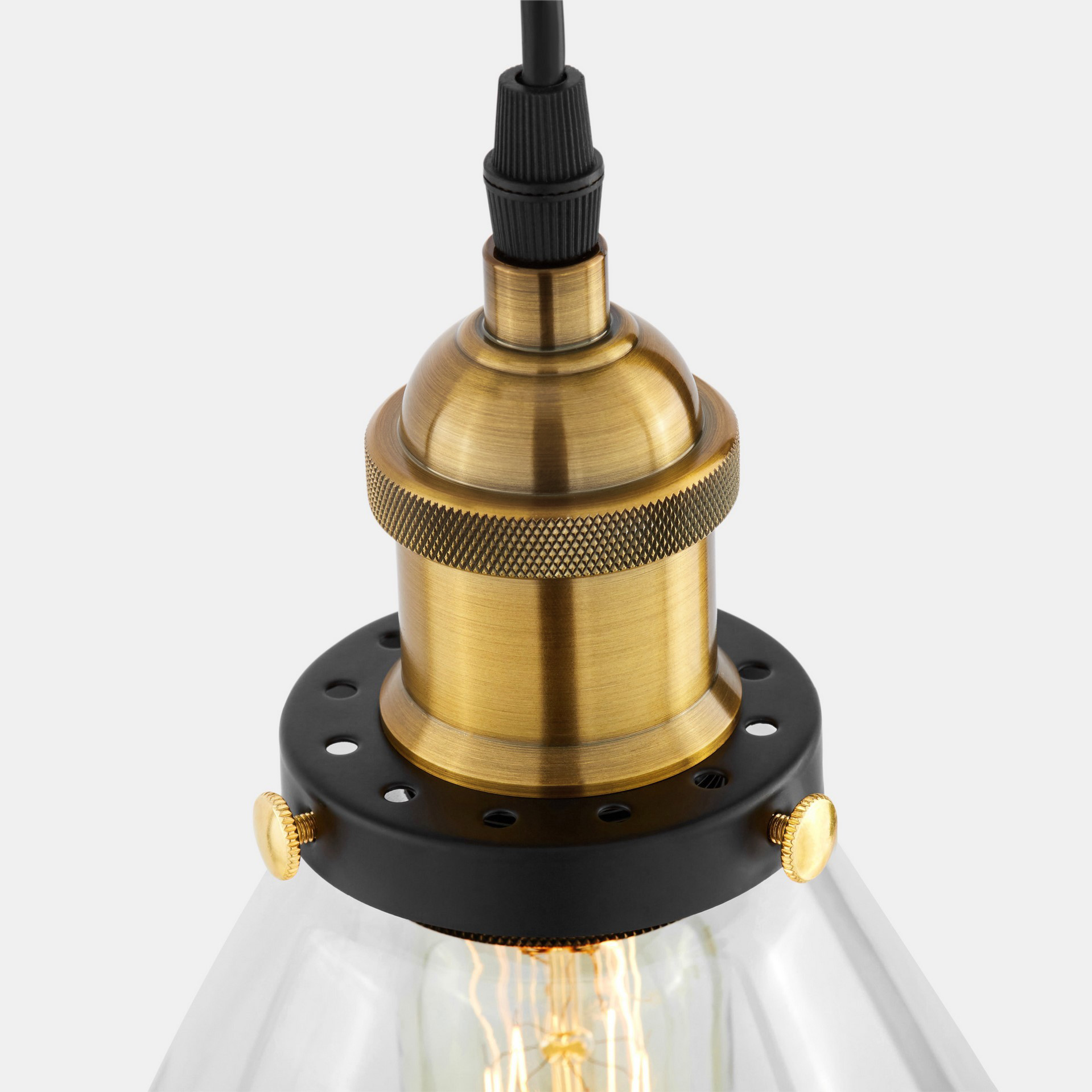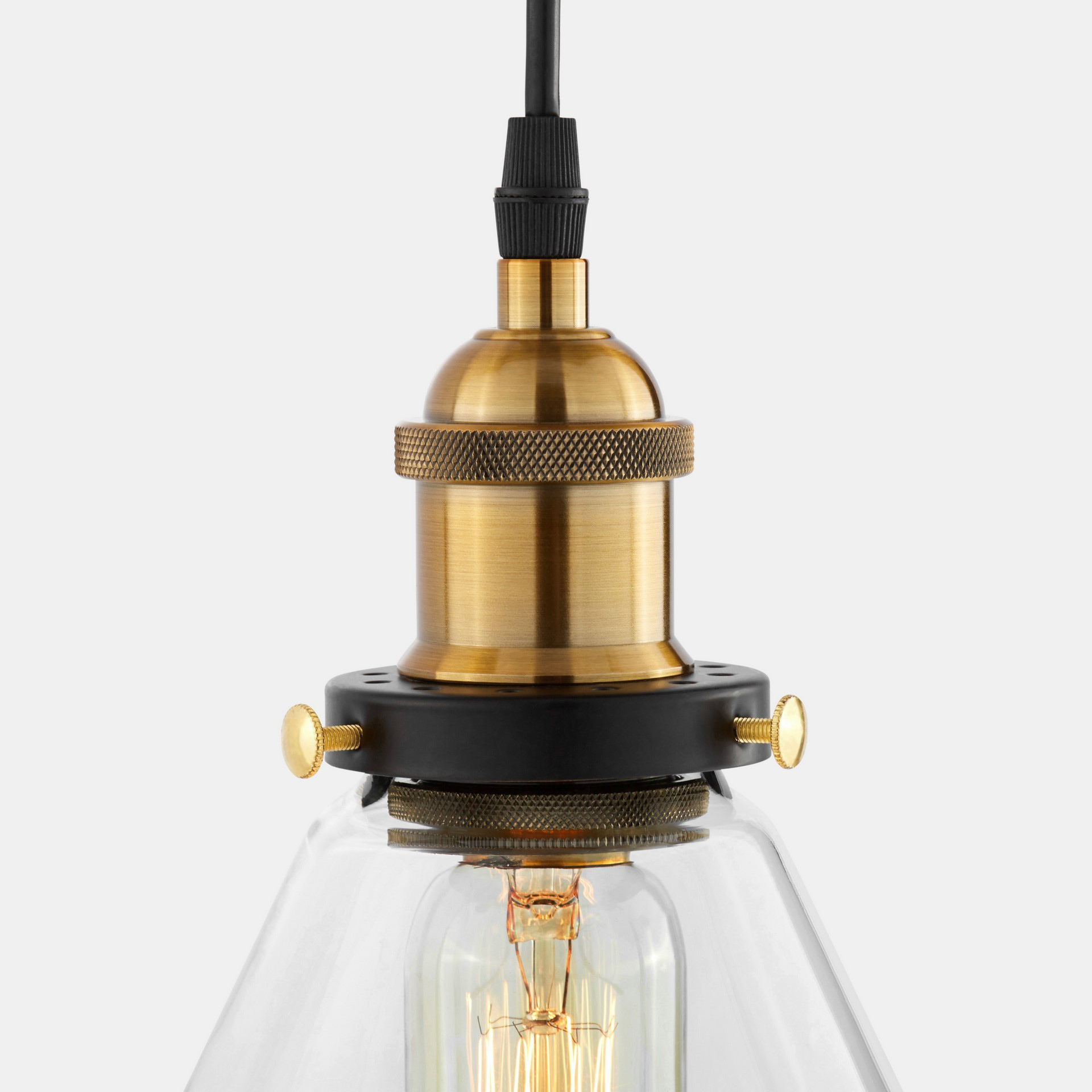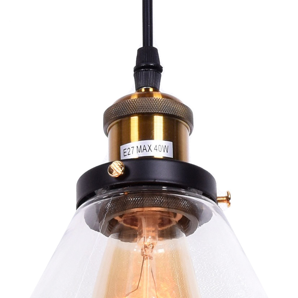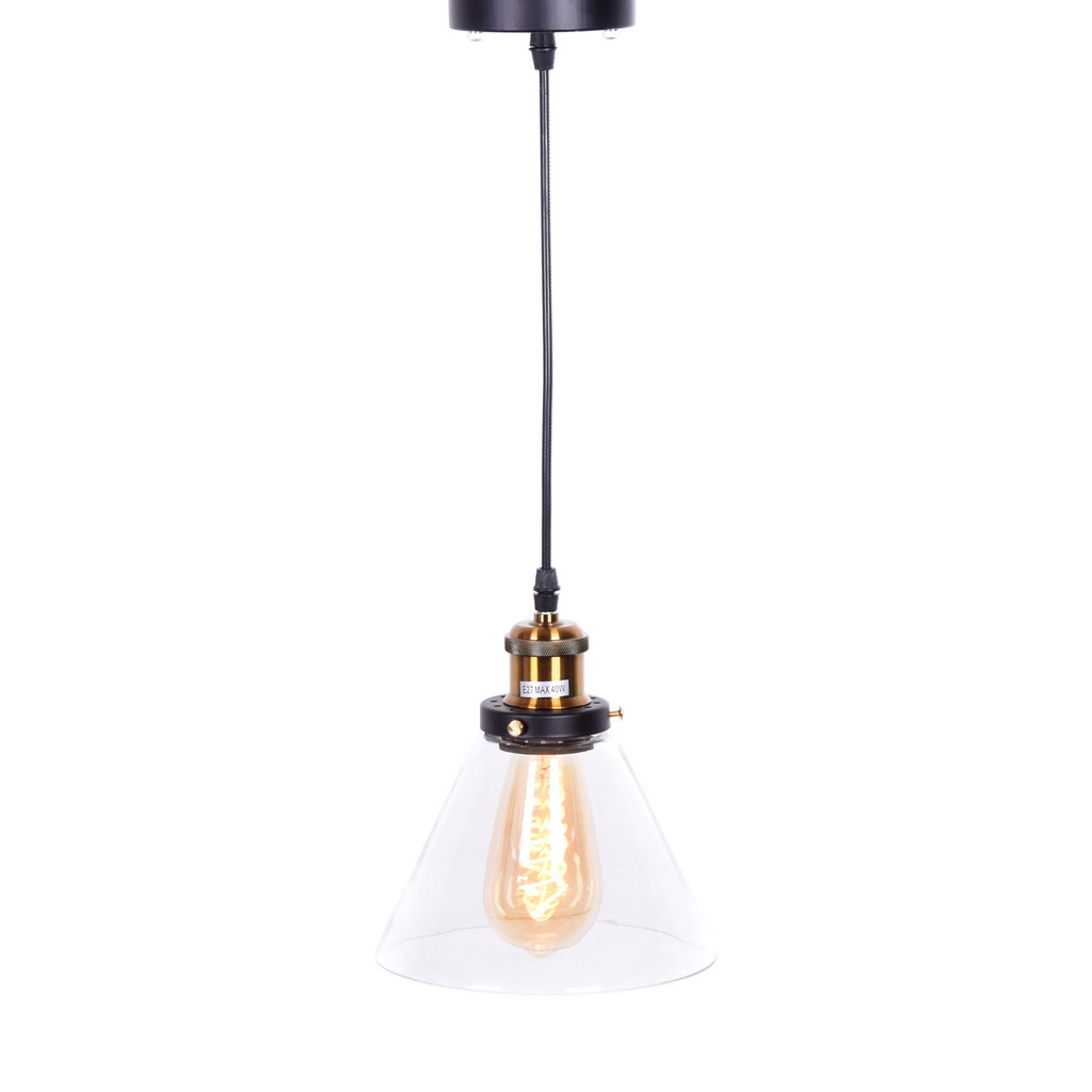 Závěsná lampa, industrialní, skandinávský lustr, v loftovém stylu. Skleněné, průzračné stínidlo ve tvaru kužele s kovovými součástky.