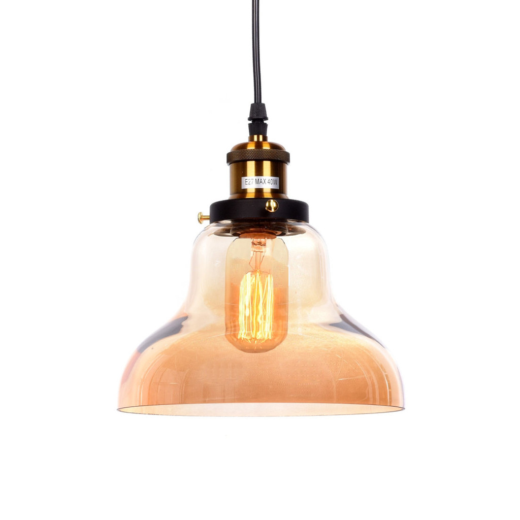 Závěsná lampa ve světle jantarové barvě. Skleněné stínidlo ve tvaru kopule. Svítidlo se hodí jak ke stulu retro nebo vintage, tak k industriálnímu, loftovému a skandinávskému.