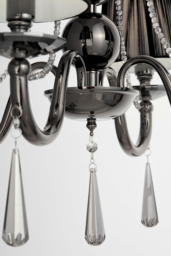 Křišťálový lustr FABIONE W4 v černé variantě. Vyroben z kovu a křišťálu, stínidla jsou látková. Svítidlo je zavěšené na nastavitelném řetízku. Ideální pro klasický styl, ložnici, obývací pokoj nebo jídelnu.