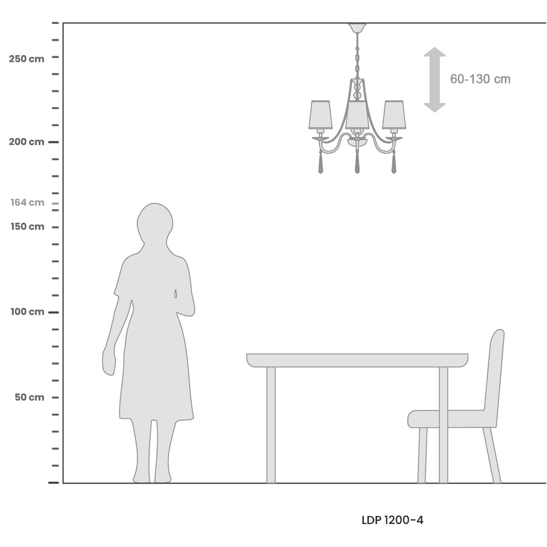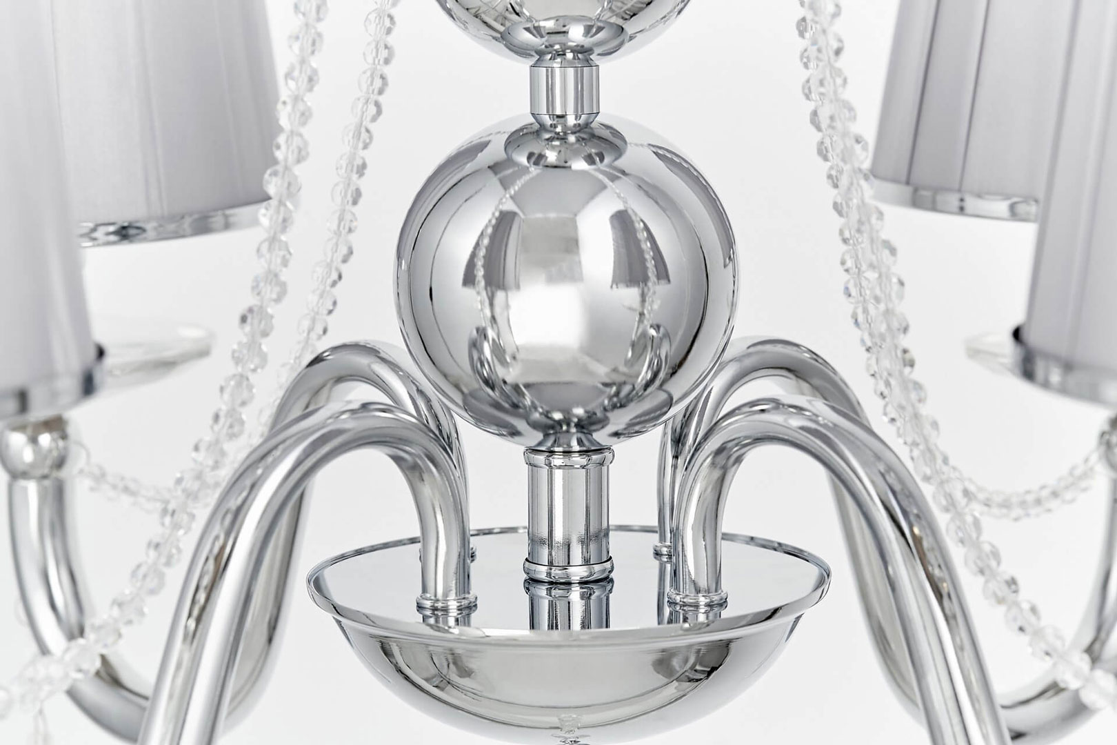 Dekorativní klasický lustr FABIONE W4 vyrobený z chromovaného kovu s ověsy z křišťálového skla té nejvyšší kvality. Svítidlo zdobí stínidla vyrobená z látky.