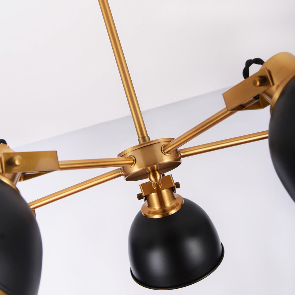 Kovové pětiramenné závěsné svítidlo BELMONTI W5 ve dvou barvách: černé a zlaté. Stínidla mají tvar kupole. Dokonale se hodí do loftových a průmyslových interiérů. Tato lampa je vhodná do obývacího pokoje, jídelny a prostor zařízených v moderním i retro stylu.