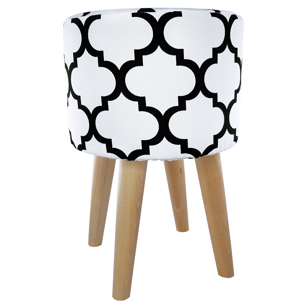 Moderní pouf ve stylu skandinávském, loftovém, s černobílým sedadlem se vzorem marockého jetele.