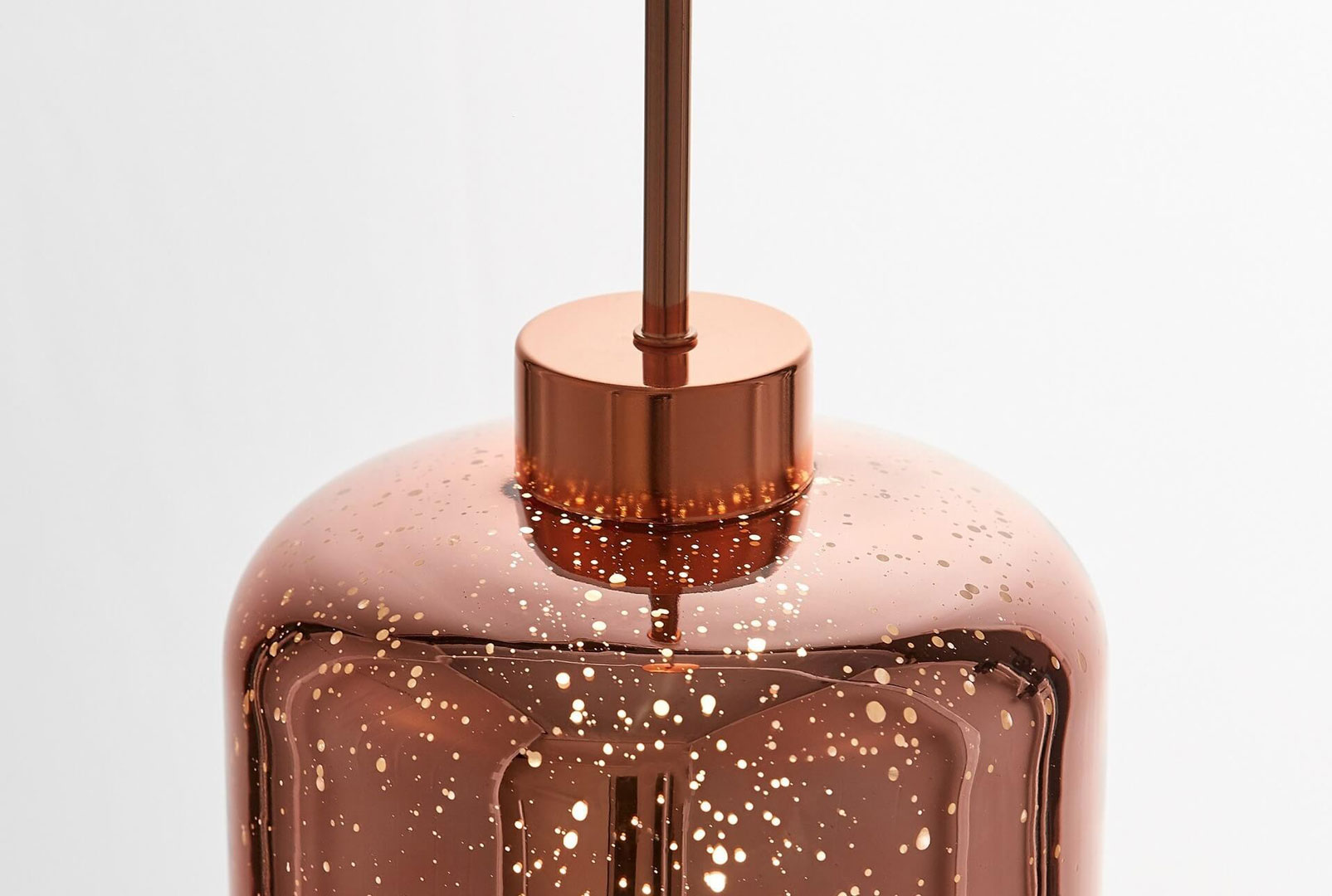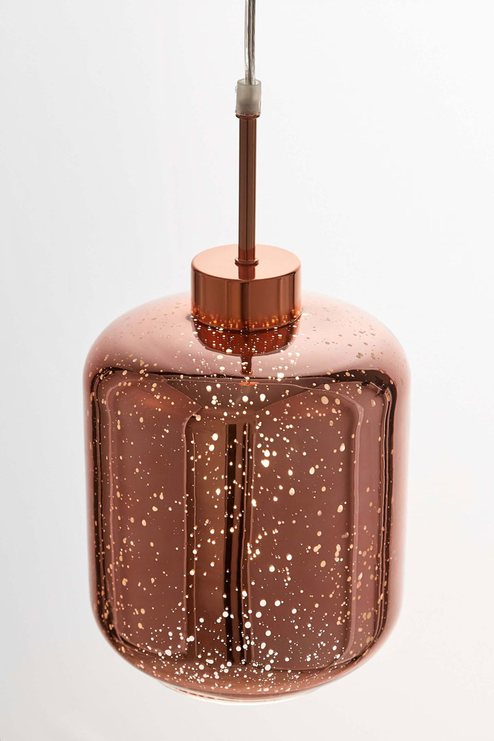Moderní závěsná lampa, svítidlo ALACOSMO se skleněným stínidlem v barvě růžového zlata (rose gold). Světlo proniká otvory viditelnými na površích stínítek, díky čemu efekt připomíná zářící hvězdy.