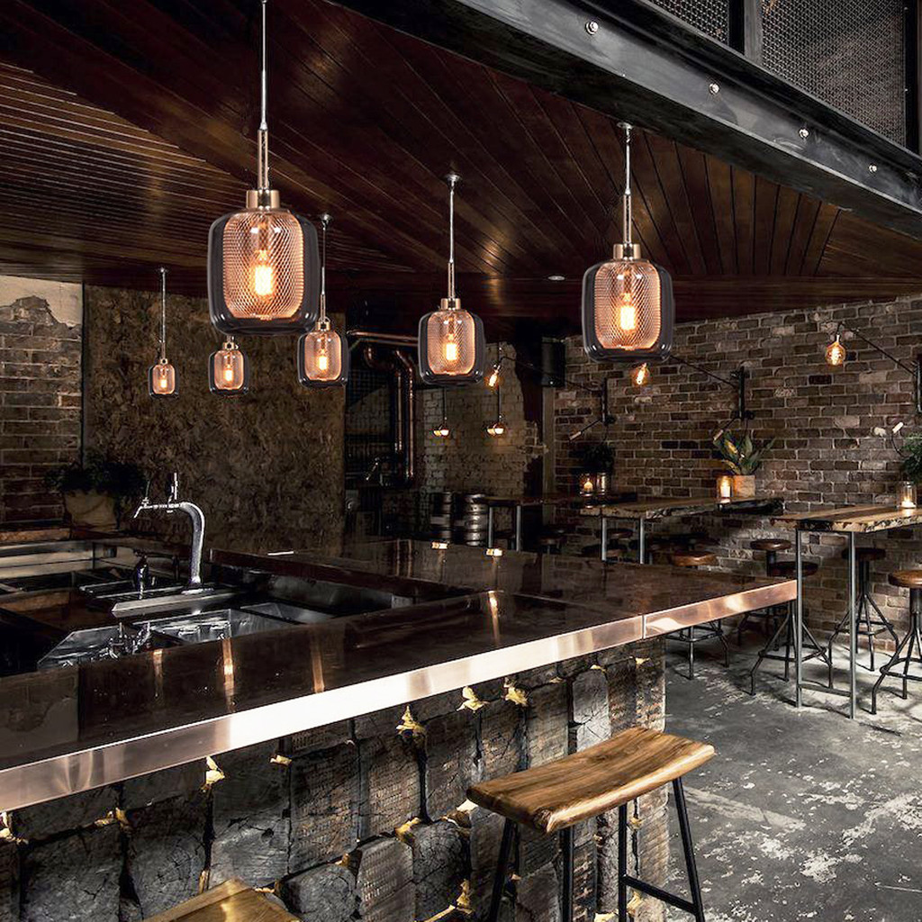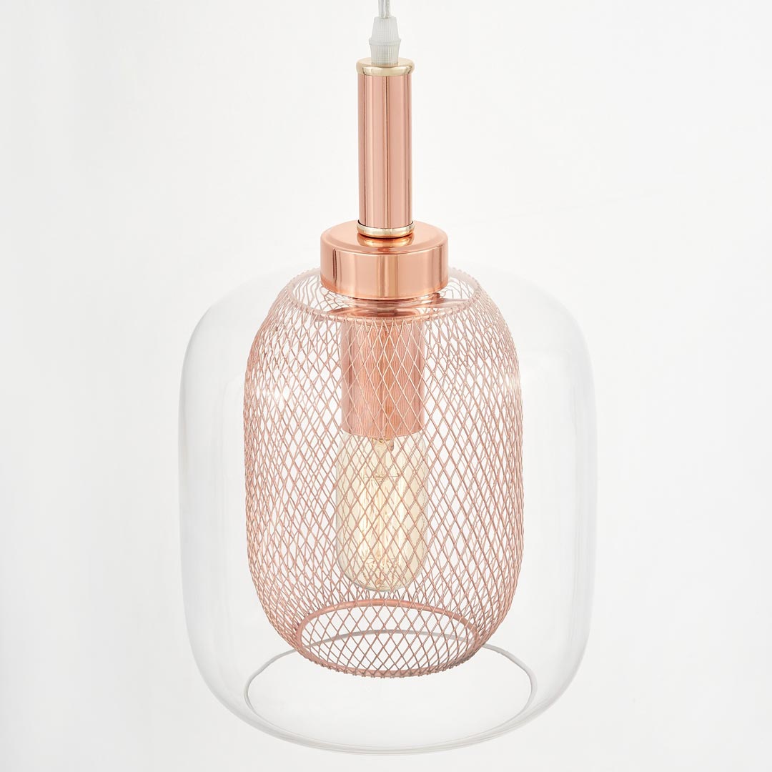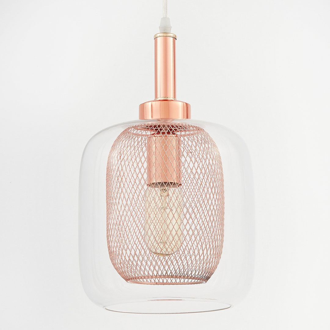 Velmi módní, moderní stropní svítidlo BESSA s ozdobnou kovovou síťkou v barvě mědi, růžového zlata a s průhledným skleněným stínidlem. Tento velmi populární model lampy vyhovuje jak skandinávským, tak i loftovým, industriálním stylům.