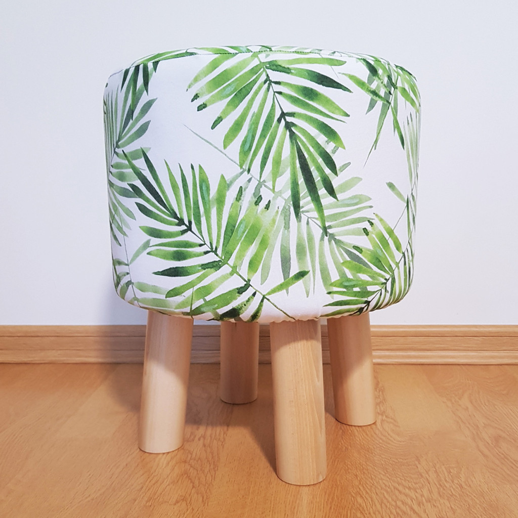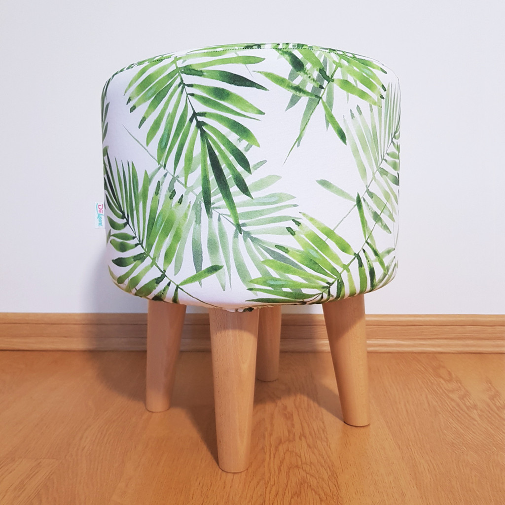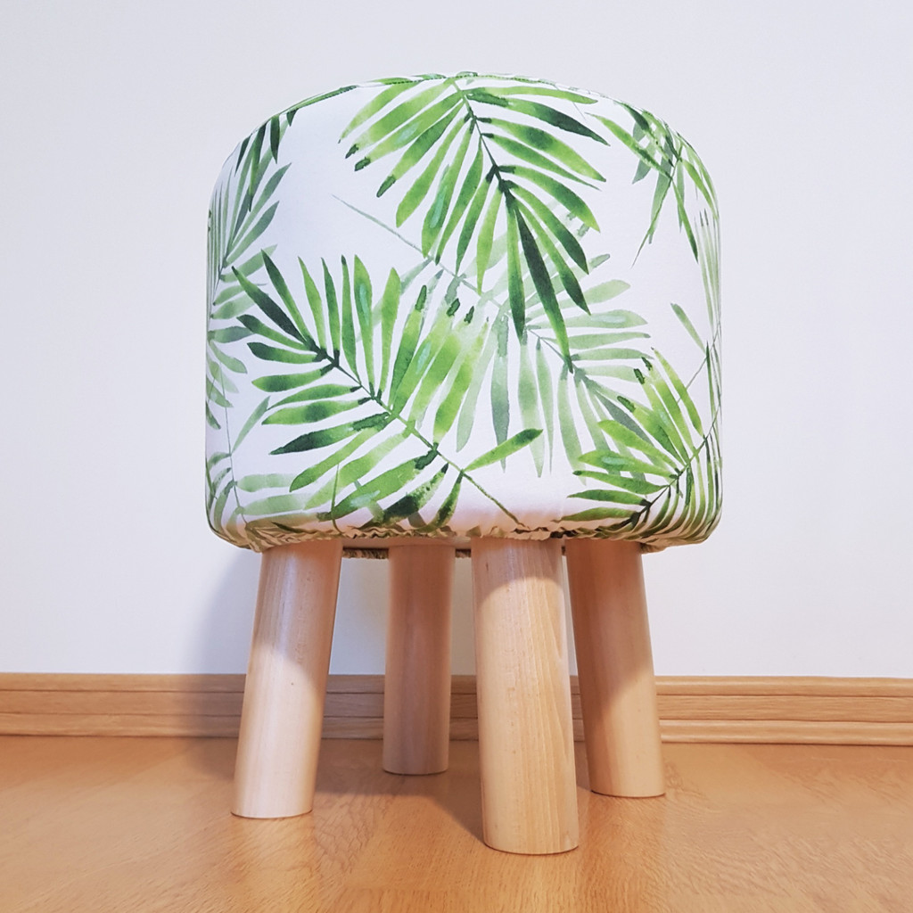 Moderní a módní stolička, skandinávský pouf se sedákem a odnímatelným potahem ve velmi módním vzoru, designu: tmavě zelené listy kapradí. Je to univerzální dřevěná stolička hodící se do obývacího pokoje, dětského pokoje a dalších místností.