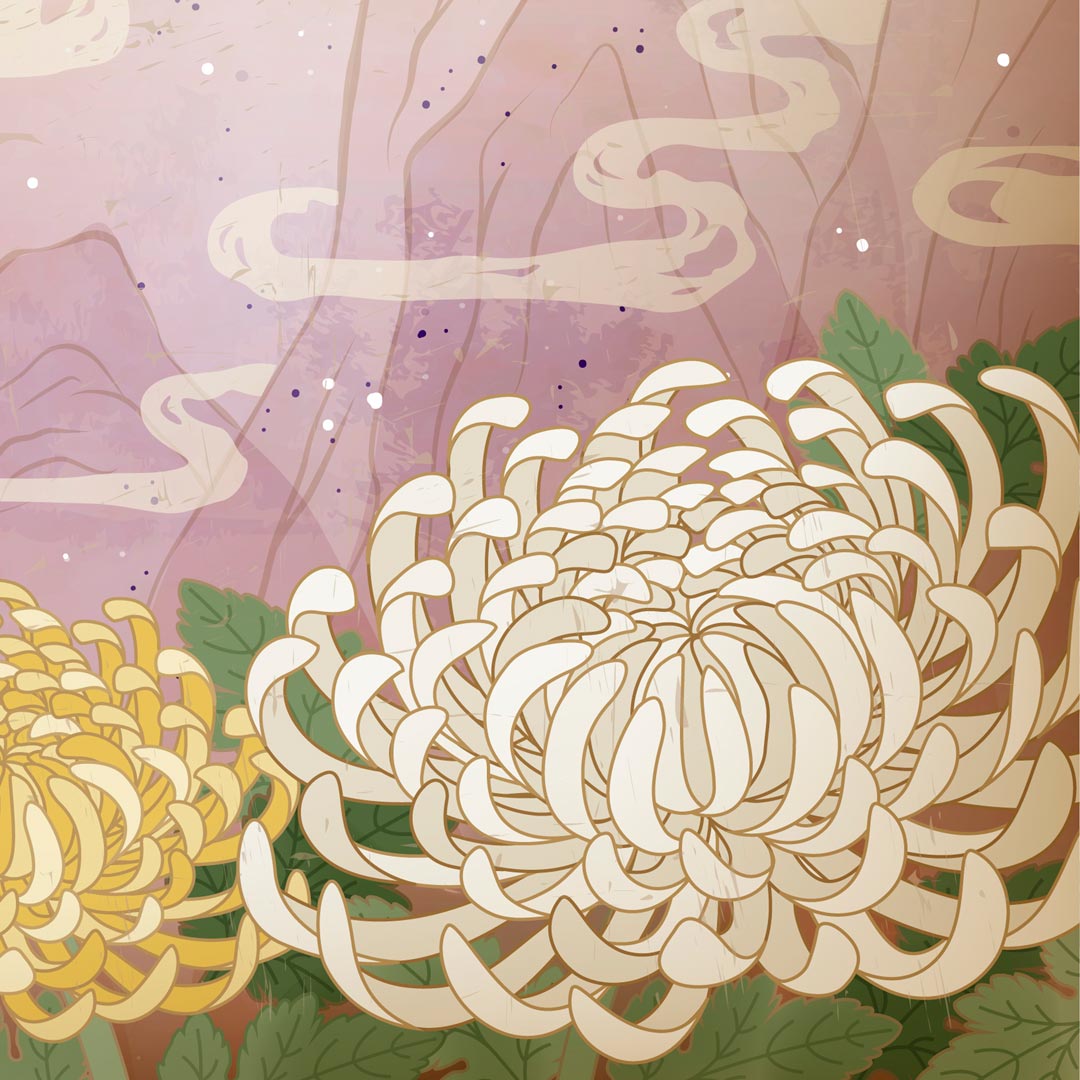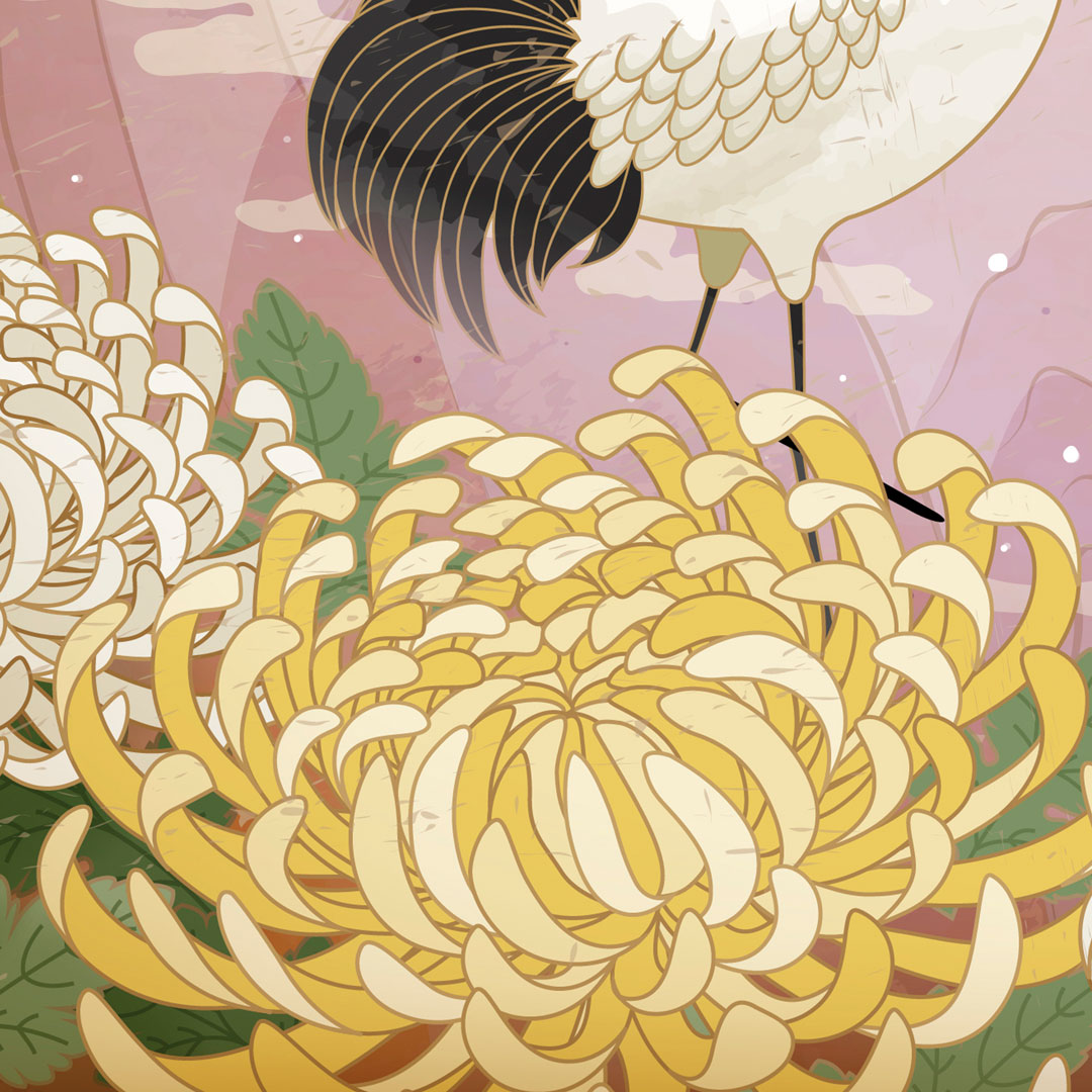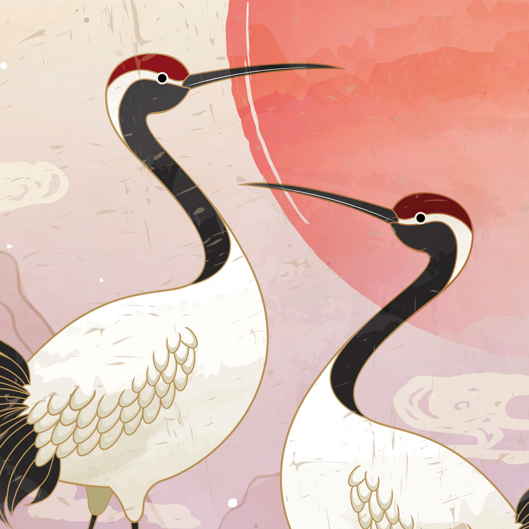 Orientální tapeta v japonském stylu se zestárlým efektem. Grafika zobrazuje volavky na květech chryzantém na pozadí červeného zapadajícího slunce a hor na obzoru.