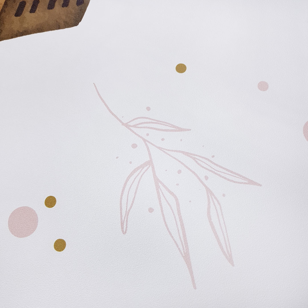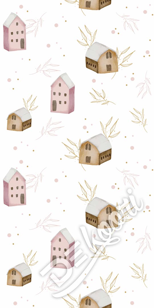 Jemná, dívčí tapeta na zeď s pohádkovými perníkovými chaloupkami, růžovými a hnědými puntíky a jemnými větvičkami. Díky možnosti změny barvy a vzoru našich tapet může být každý domeček takový, jaký chcete!