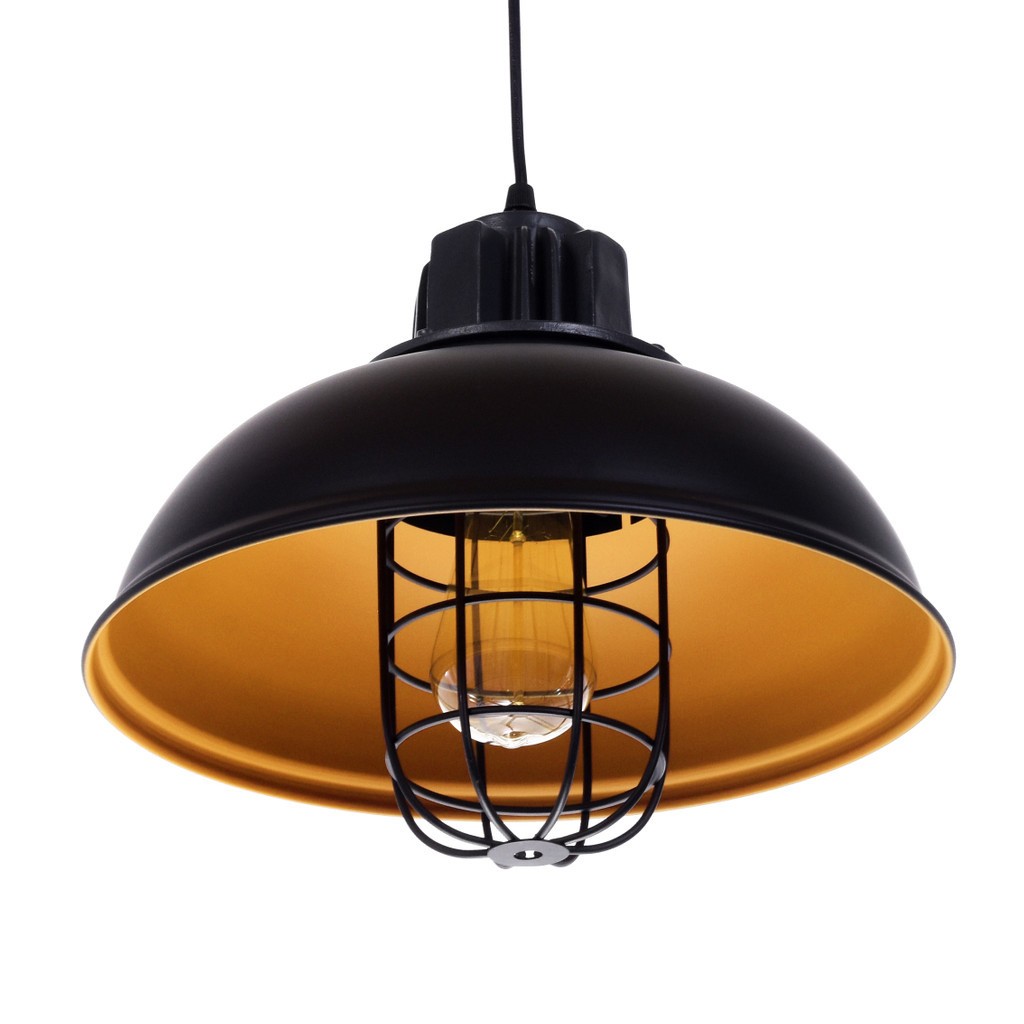 Závěsná lampa FUKO v loftovém stylu. Kovové stínidlo je matně černé, uvnitř má medový odstín. Má designový drátěný kryt na žárovku. Lampa je ideální pro obývací pokoj, kuchyň nebo prostory.