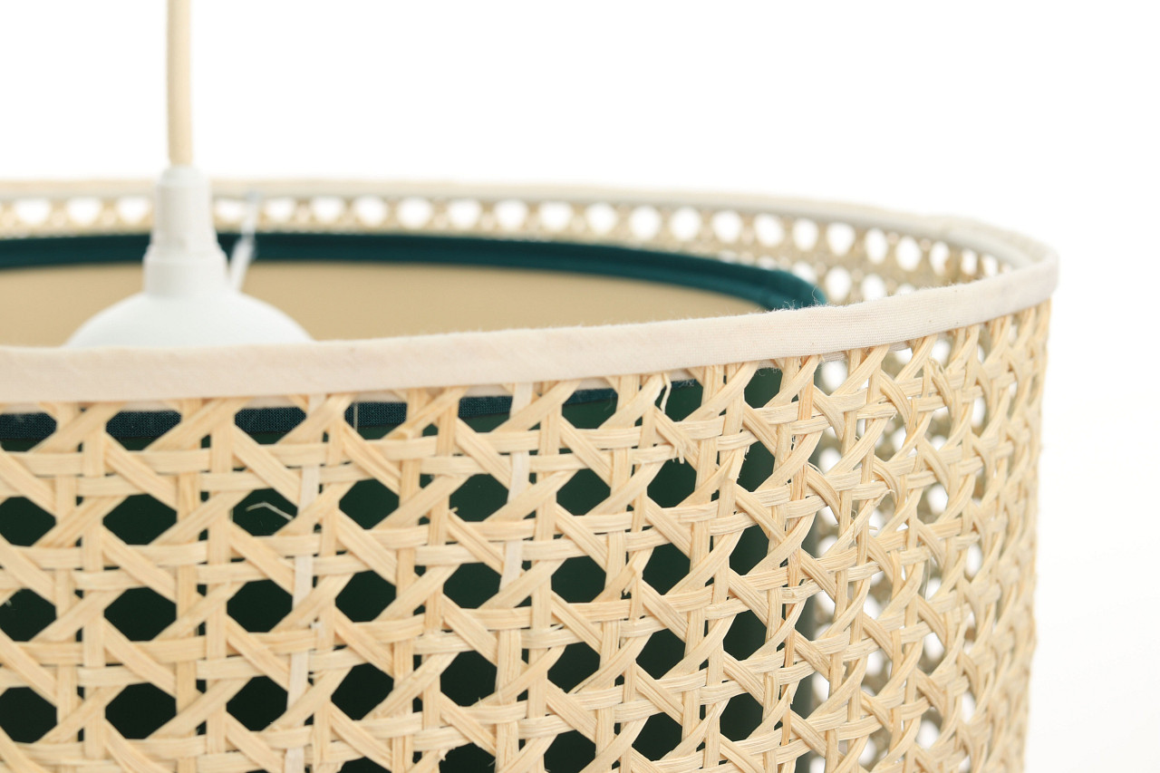 Přírodní závěsná lampa se stínidlem ve tvaru válce z palmových vláken ratanu a zeleného PVC materiálu ROTANG