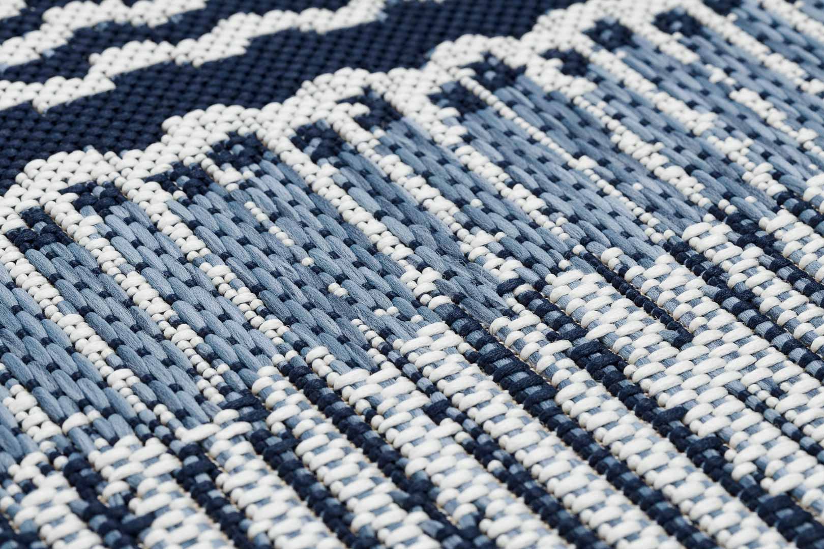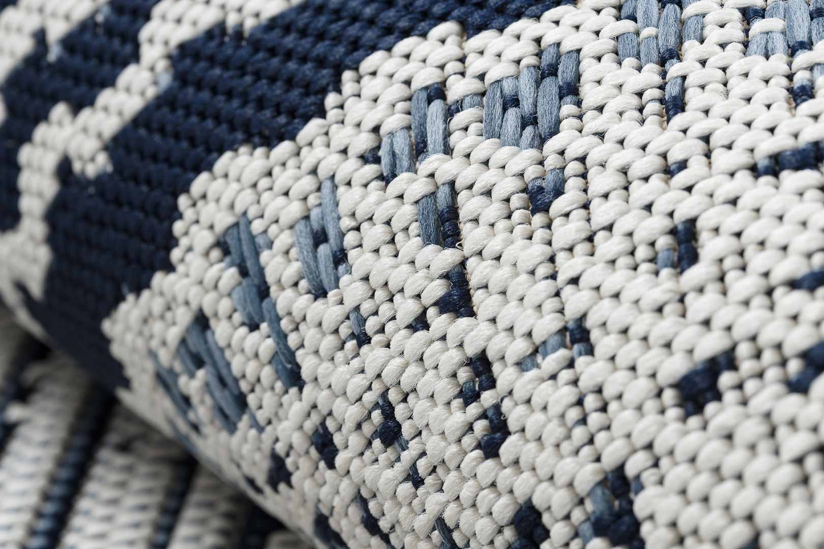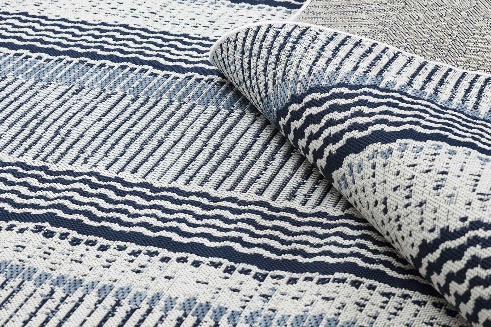 Tento plochý tkaný koberec s výraznými bílými, modrými a námořnickými pruhy bude skvělým akcentem, který osvěží moderní obývací pokoj nebo jakékoli Vaše oblíbené místo v domě! Skvěle se bude hodit do interiérů v boho nebo skandinávském stylu. Díky voděodolnému polypropylenu, z něhož je vyroben, bude lahodit oku a zdobit po velmi dlouhou dobu. A to jak v interiérech, tak na balkonech či terasách.