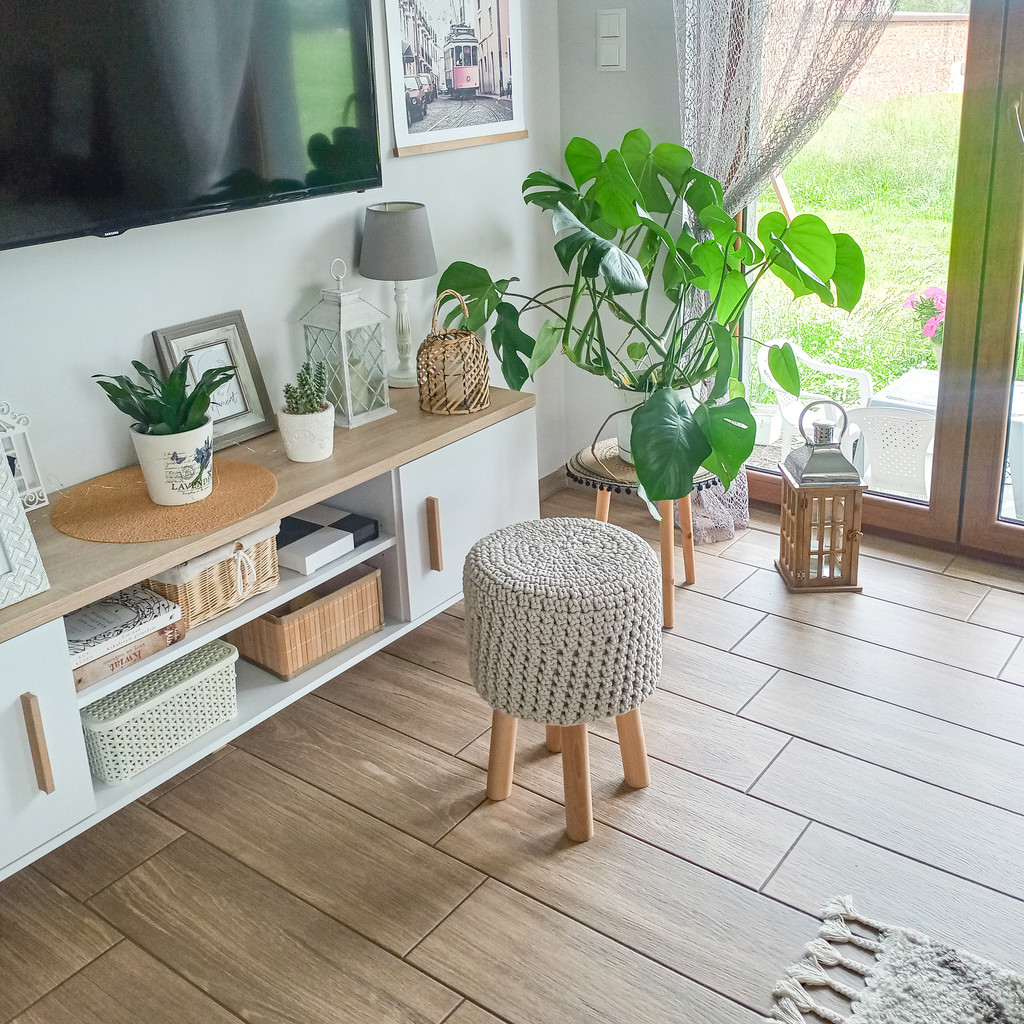 Elegantní, velmi módní stolička s teplým a měkkým potahem. Povlak je ručně háčkovaný, díky čemuž je výjimečný. Ideální pro rustikální a skandinávské interiéry.