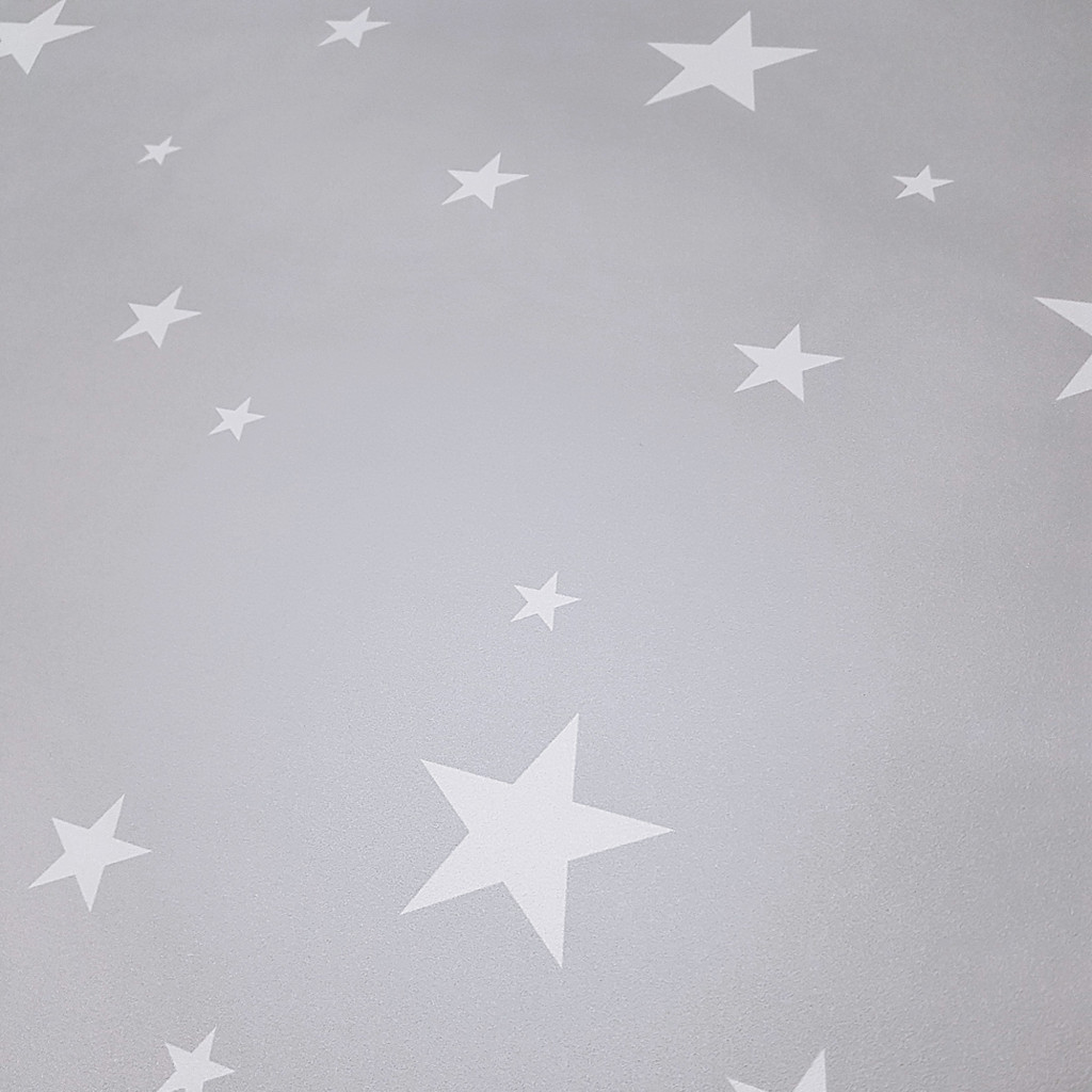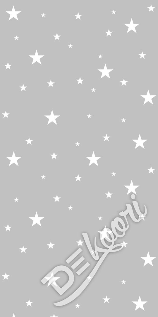 Dekorativní šedo-bílá tapeta na zeď s hvězdami ve velikostech 3, 5 a 10 cm. Jemný vzor se bude hodit mimo jiné jako tapeta pro děti v dětském pokoji. Čistý šedý odstín bez příměsi dalších barev.