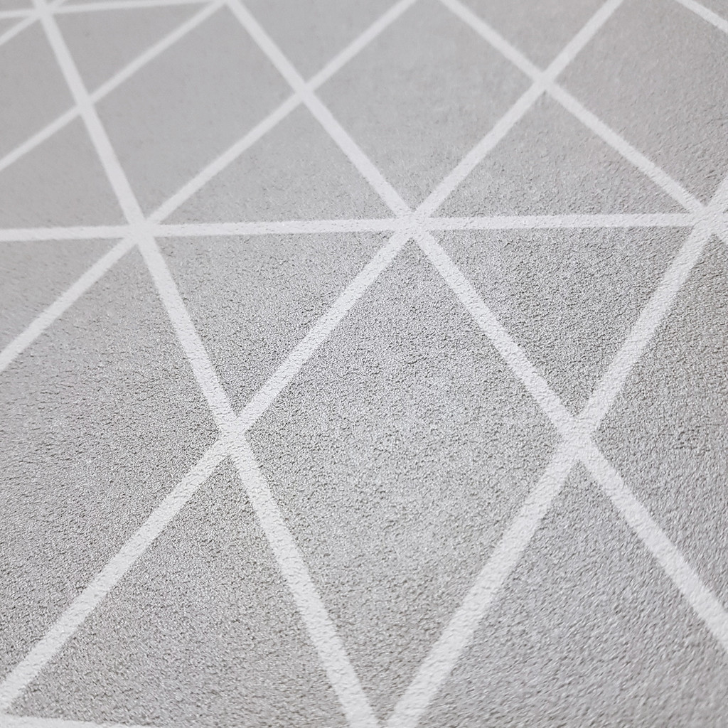 Šedá, pastelová, geometrická tapeta s bílými čarami, které tvoří síťku z trojúhelníků a kosočtverců. Minimalistický geometrický vzor: tenké bílé čáry na šedém pozadí. Perfektní na stěny v moderních interiérech.