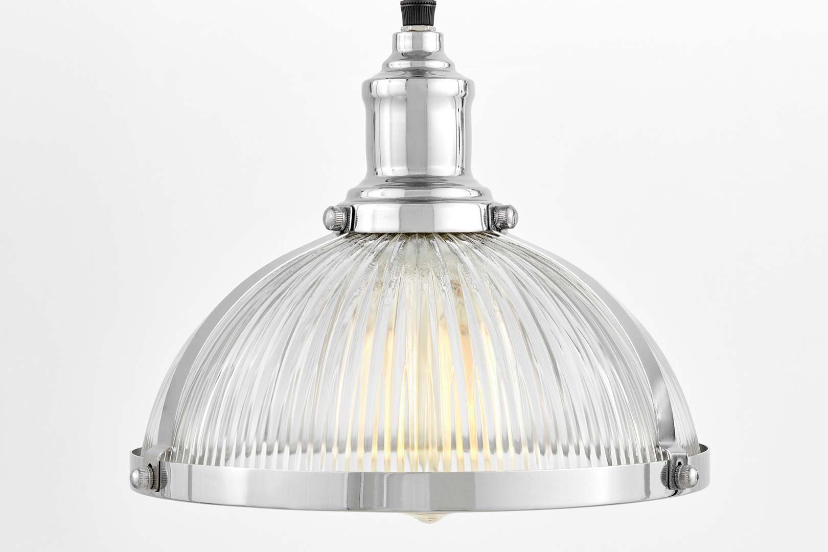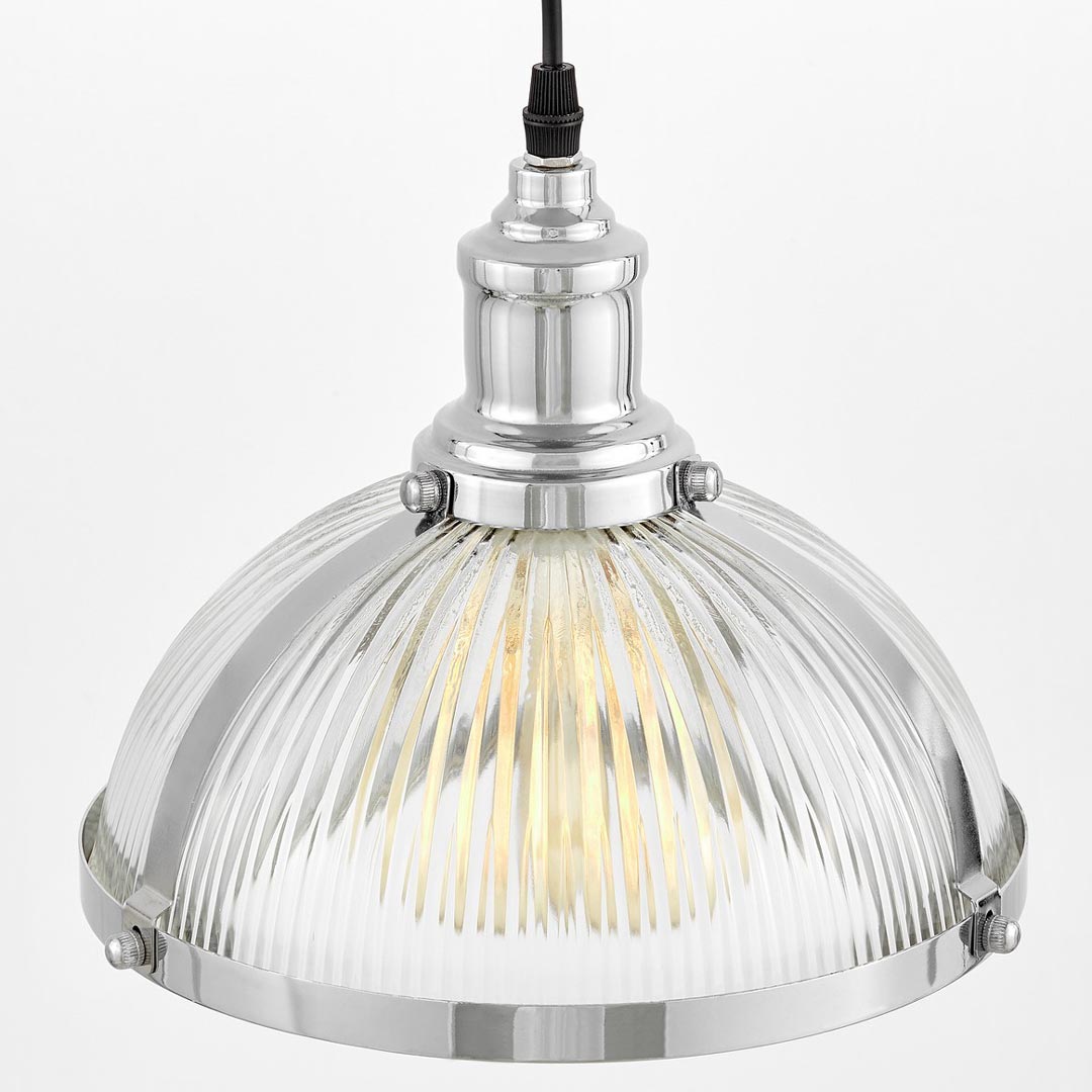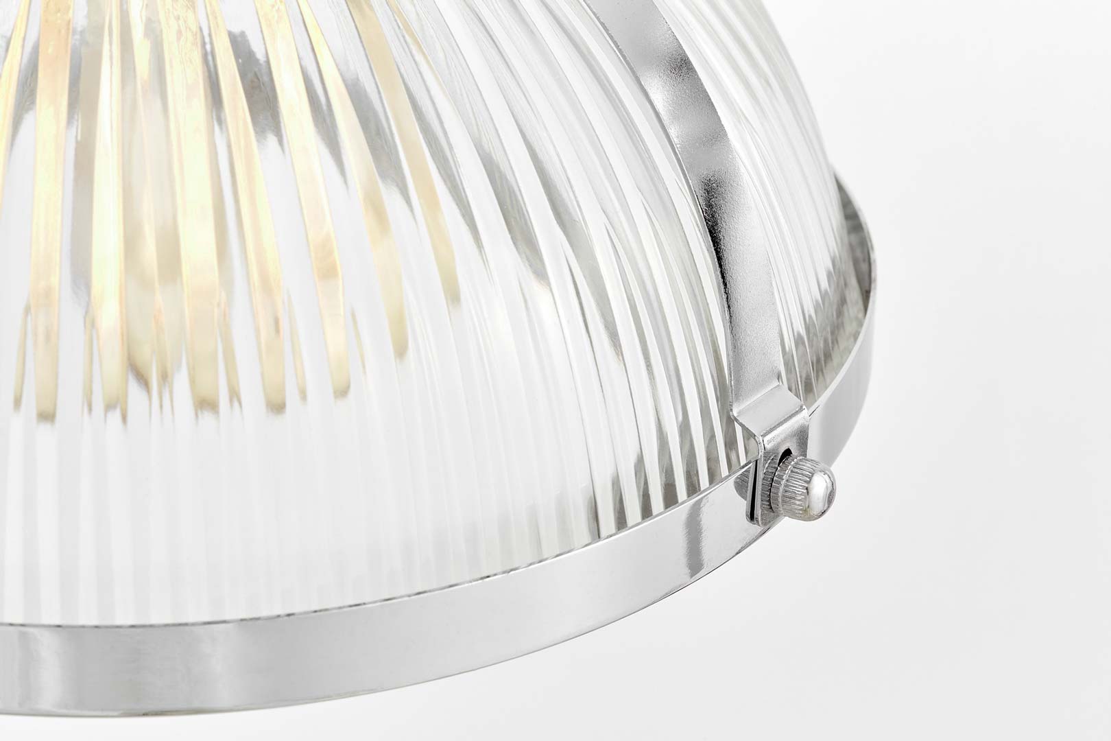 Průhledná průmyslová lampa BRICO s černými a chromovými prvky. Vyrobena ze skla a kovu. Zavěšena na nastavitelném kabelu. Ideální do kuchyně, jídelny i jiných prostorů.