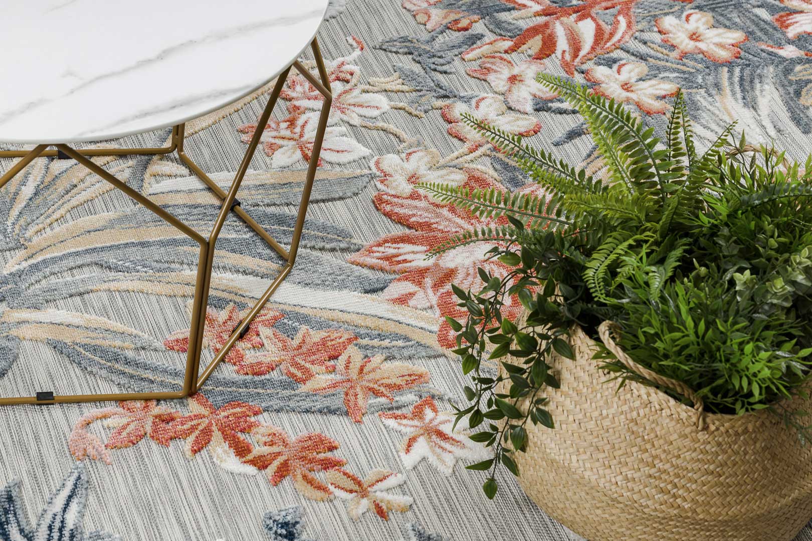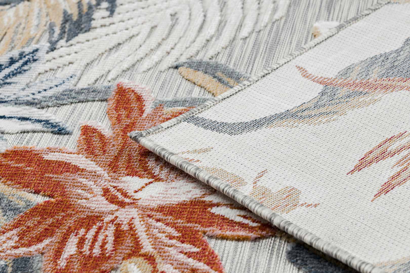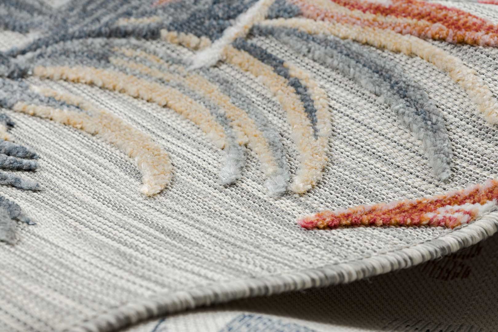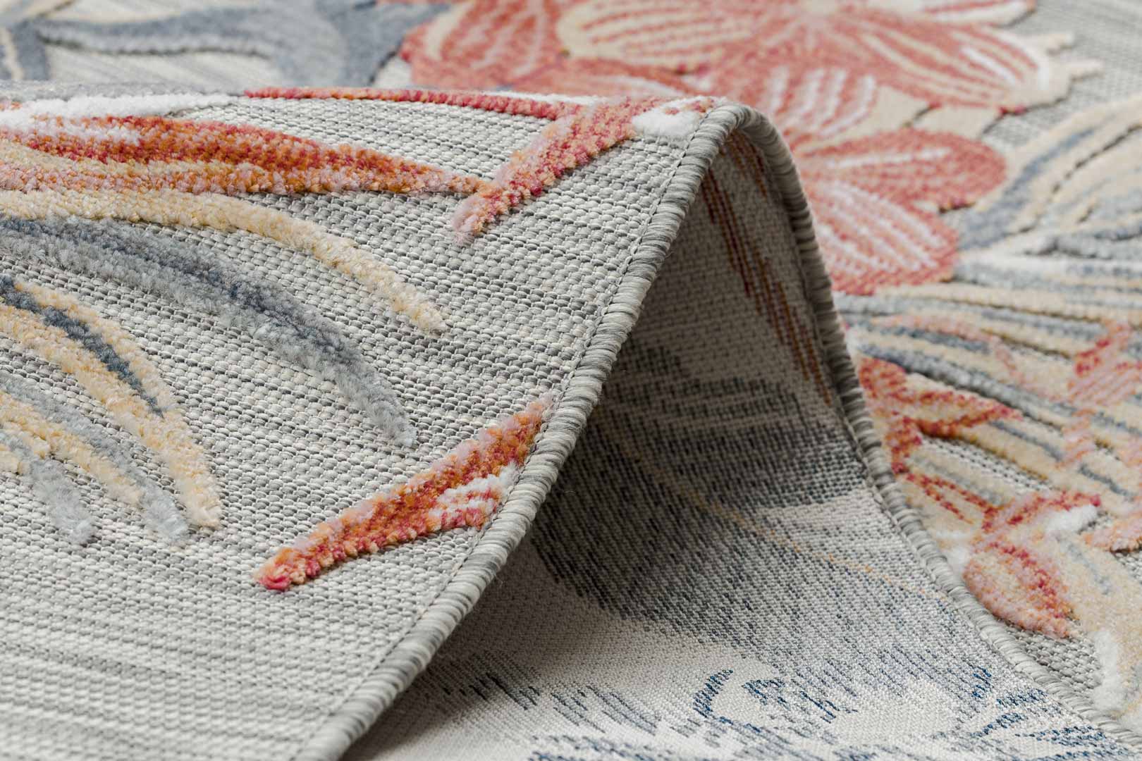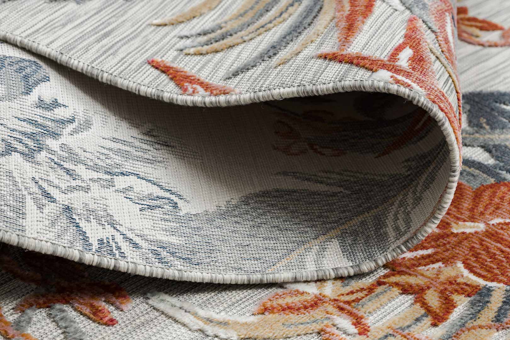 Tento koberec je umění samo o sobě! Tato originální kombinace originálního květinového vzoru a jemných barev: šedé, cihlové (červené) a žluté, navodí příjemnou atmosféru jak v minimalistické ložnici, tak v rustikálním obývacím pokoji. Při výrobě jsou použity dvě úrovně vlasu: plošně tkaná vlákna a tradiční řezaný vlas. Bez námahy se vysávají, což je velmi nápomocné při udržování estetického vzhledu koberce a jeho dlouhodobé čistoty. Koberec lze používat i venku, protože je odolný vůči povětrnostním vlivům.