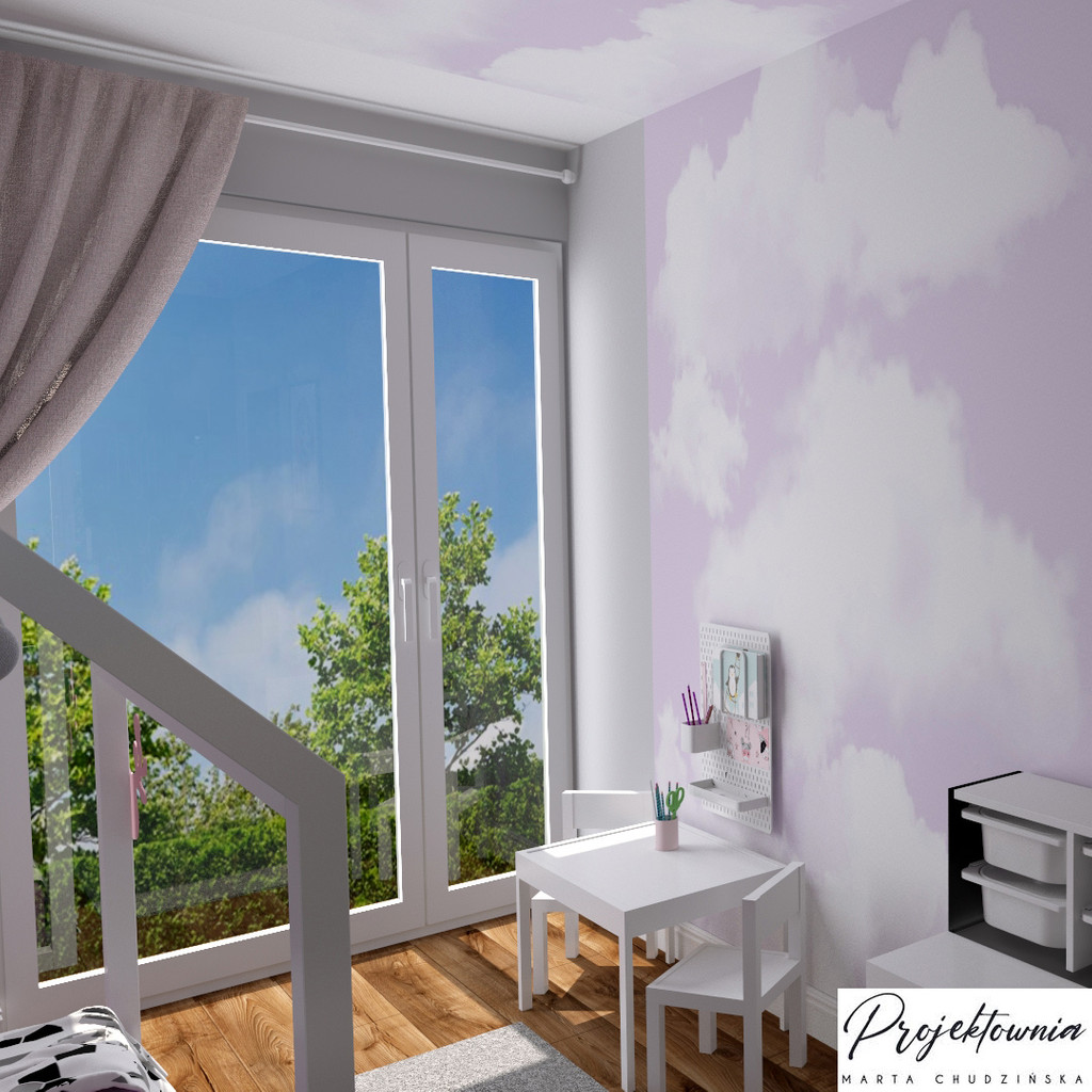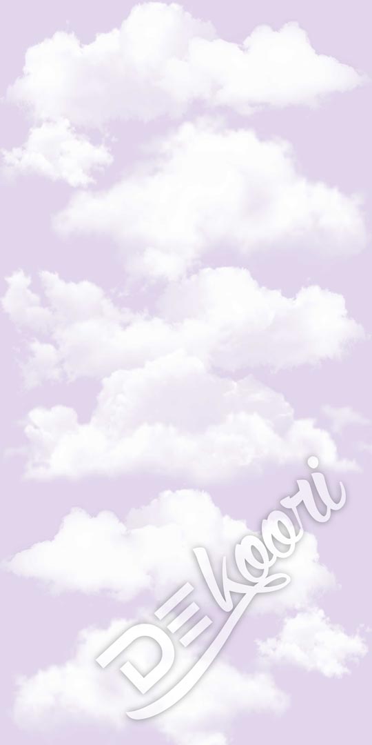 Jemná, světle fialová fototapeta s bílými oblaky, mráčky. Skvěle se bude hodit do dětského pokoje nebo ložnice, díky čemu se budete moci každý den probouzet s hlavou v oblacích.