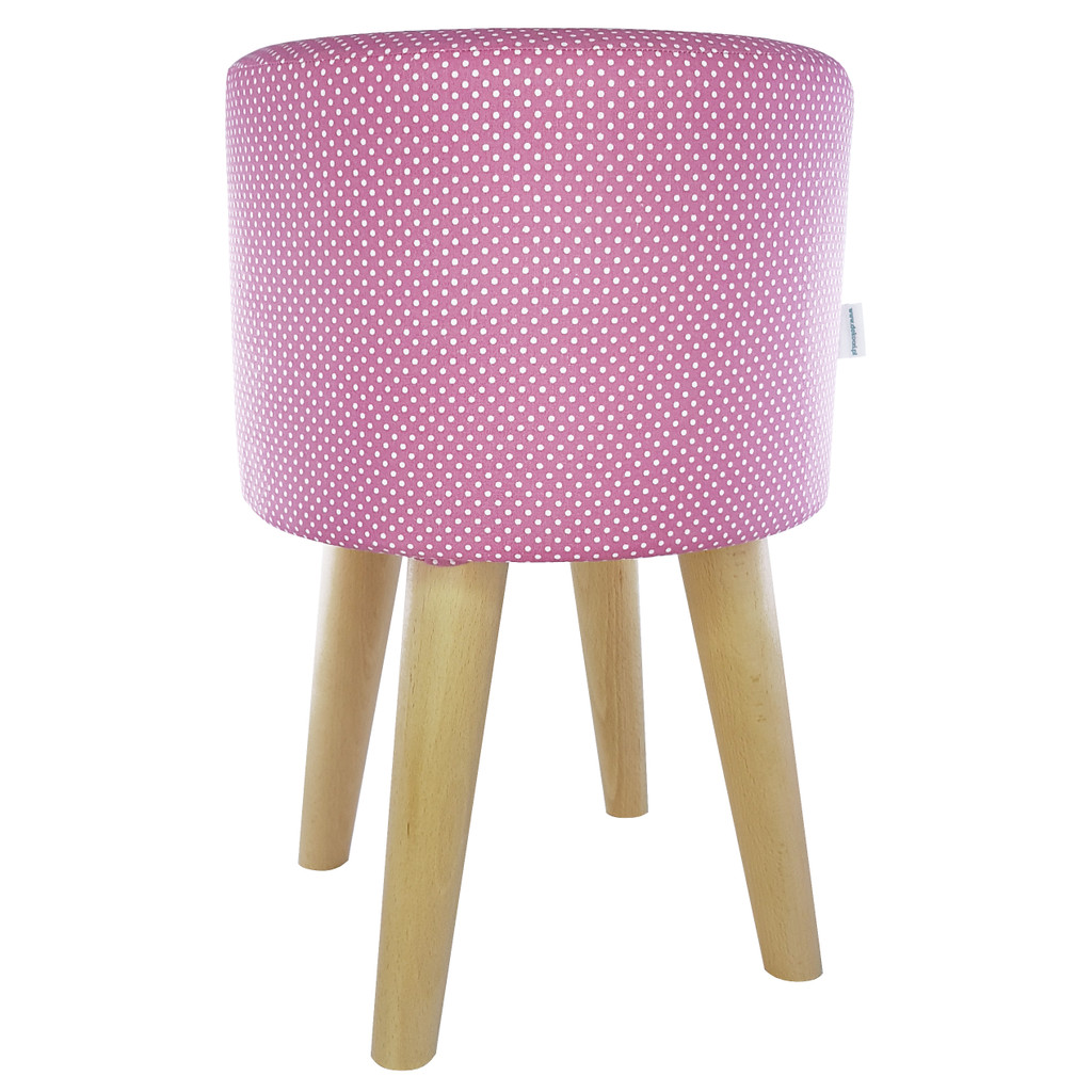 Zajímavý, stylový taburet, podnožka, s růžovým (fuchsiovým) kulatým sedadlem a odnímatelným potahem s bílými tečkami, puntíky. Vhodný pro různé interiéry, např. do obýváku nebo ložnice.