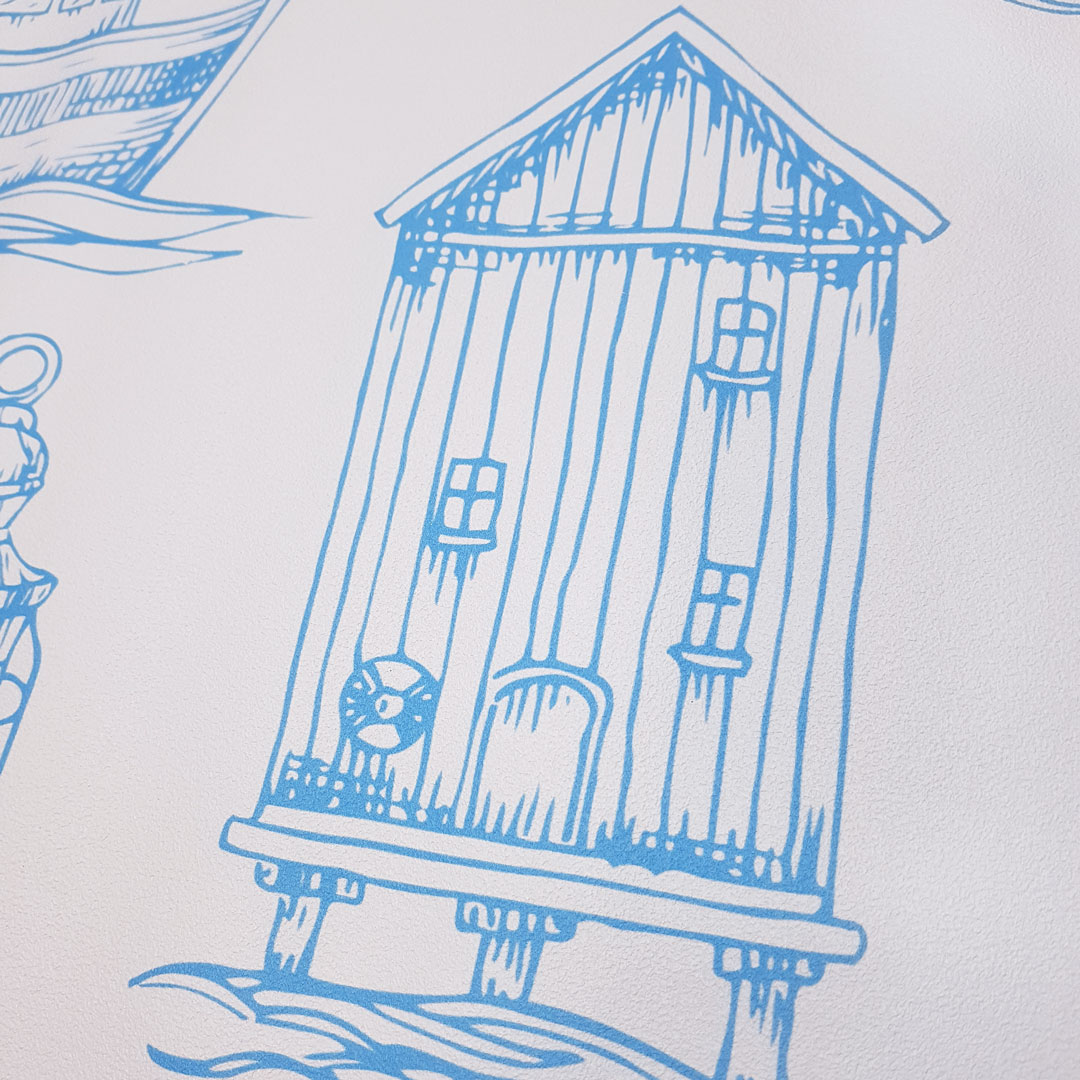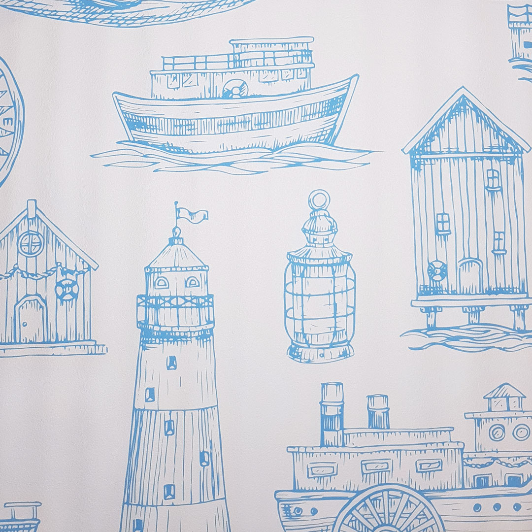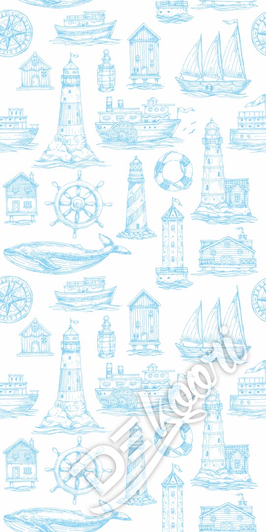 Bílá námořní tapeta se světle modrými majáky, loděmi, kormidly, větrnými růžicemi, záchrannými kruhy a velrybami. Je to druhá barevná verze tohoto unikátního vzoru. Bude ideální jak do pokoje malého cestovatele, tak i do obývacího pokoje nebo restaurace.