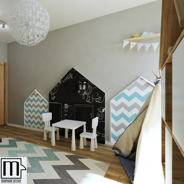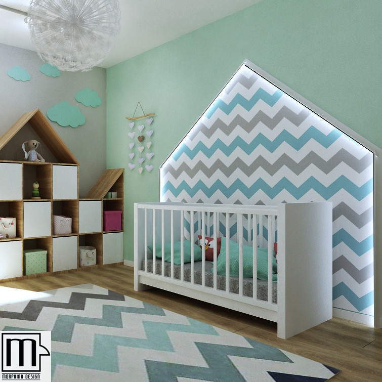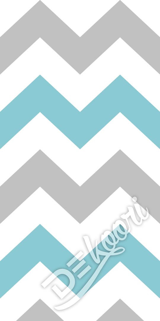 Dekorativní a moderní tapeta s cik-cak vzorem v barvách bílé, šedé, modré (azurové).