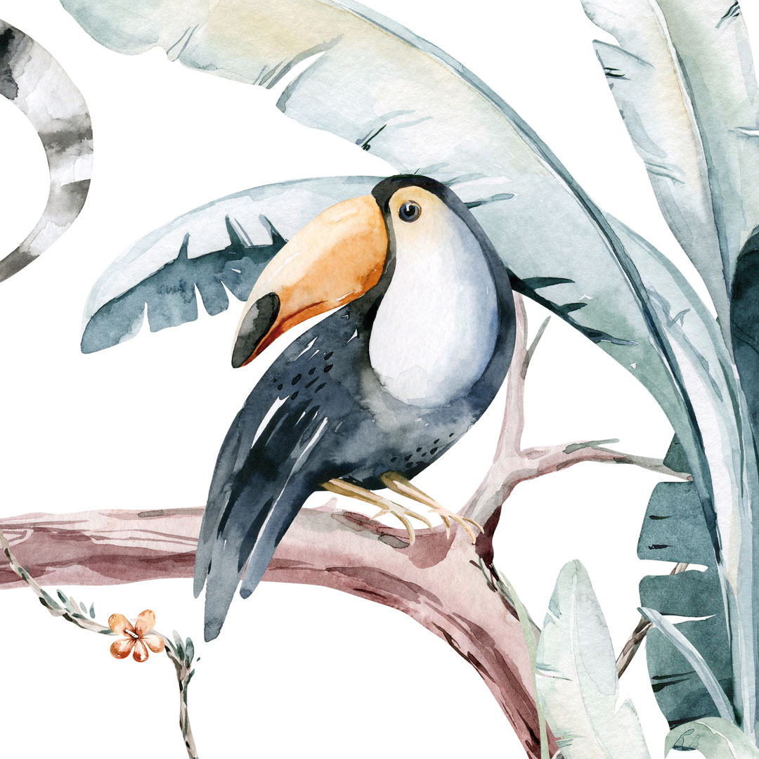 Tato krásná a barevná tapeta ve stylu akvarelu vezme vaše dítě na objevnou cestu exotickou džunglí. Díky dětskému safari si může mezi liánami a banánovými listy zblízka prohlédnout divoká, ale přátelská zvířata: žirafu, lemura, tukana, nosorožce, plameňáka a slona.