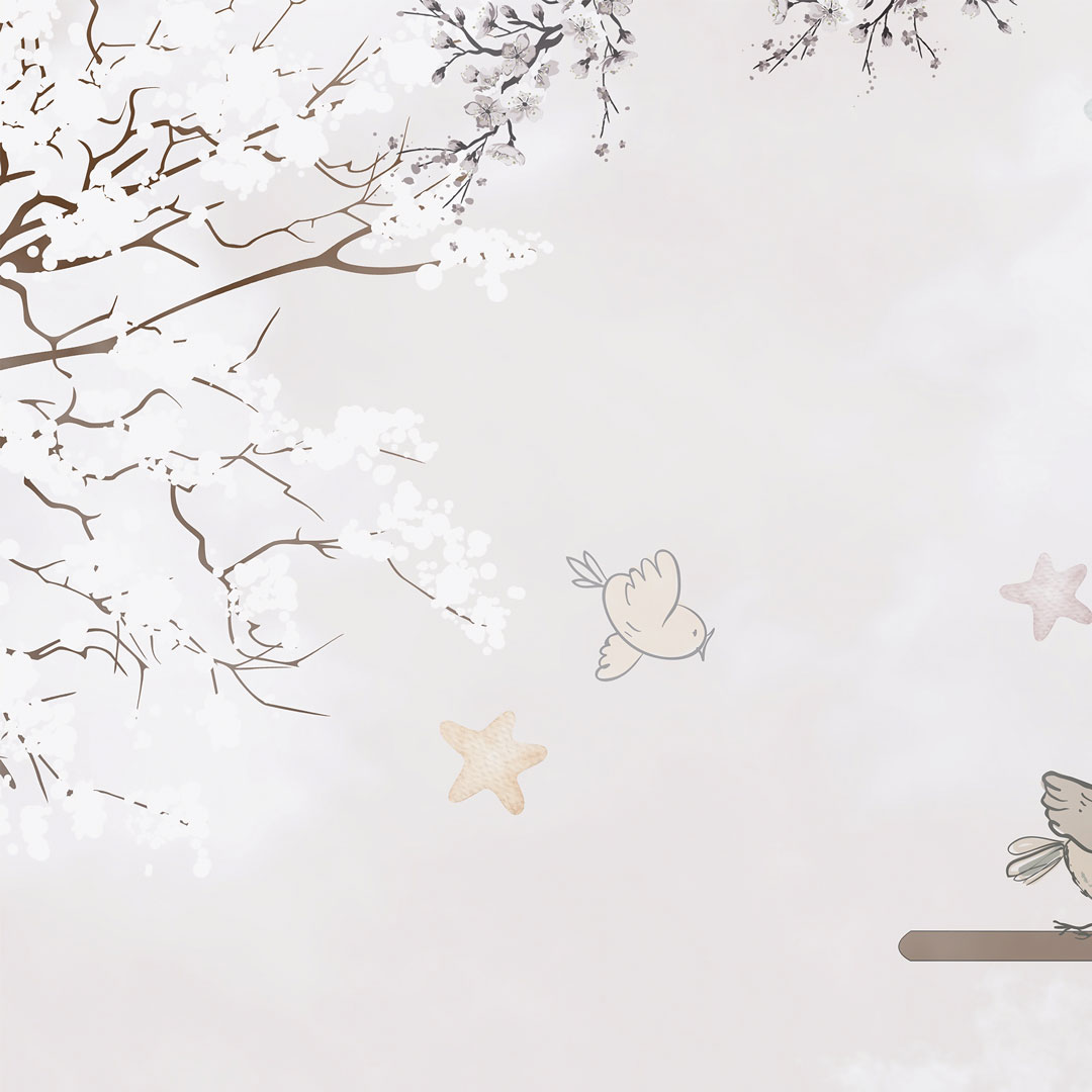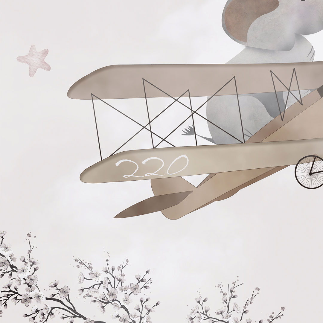 Béžová tapeta na zeď pro děti - cestování aeroplánem. Rozjásaná zvířátka (žirafa, slon a panda) létají po obloze mezi mraky a hvězdami v letadlech s vrtulemi v retro stylu. Malí ptáčci, zjevně zvědaví na tuto neobvyklou podívanou, sedají na křídla dvouplošníků, aby si odpočinuli a vše si prohlédli zblízka. Návrh je proveden převážně v pastelových akvarelových tónech béžové, hnědé a krémové barvy.