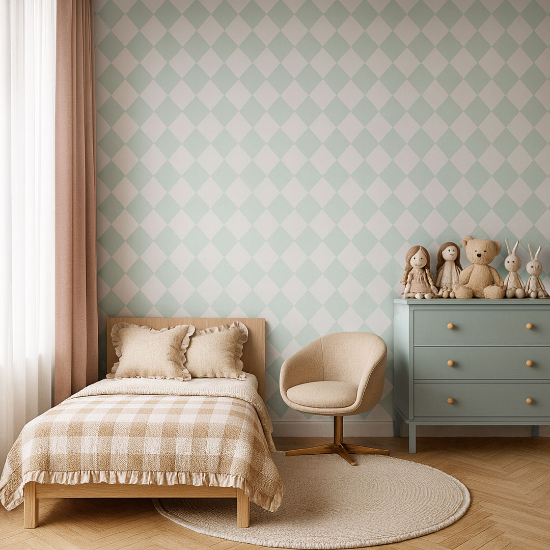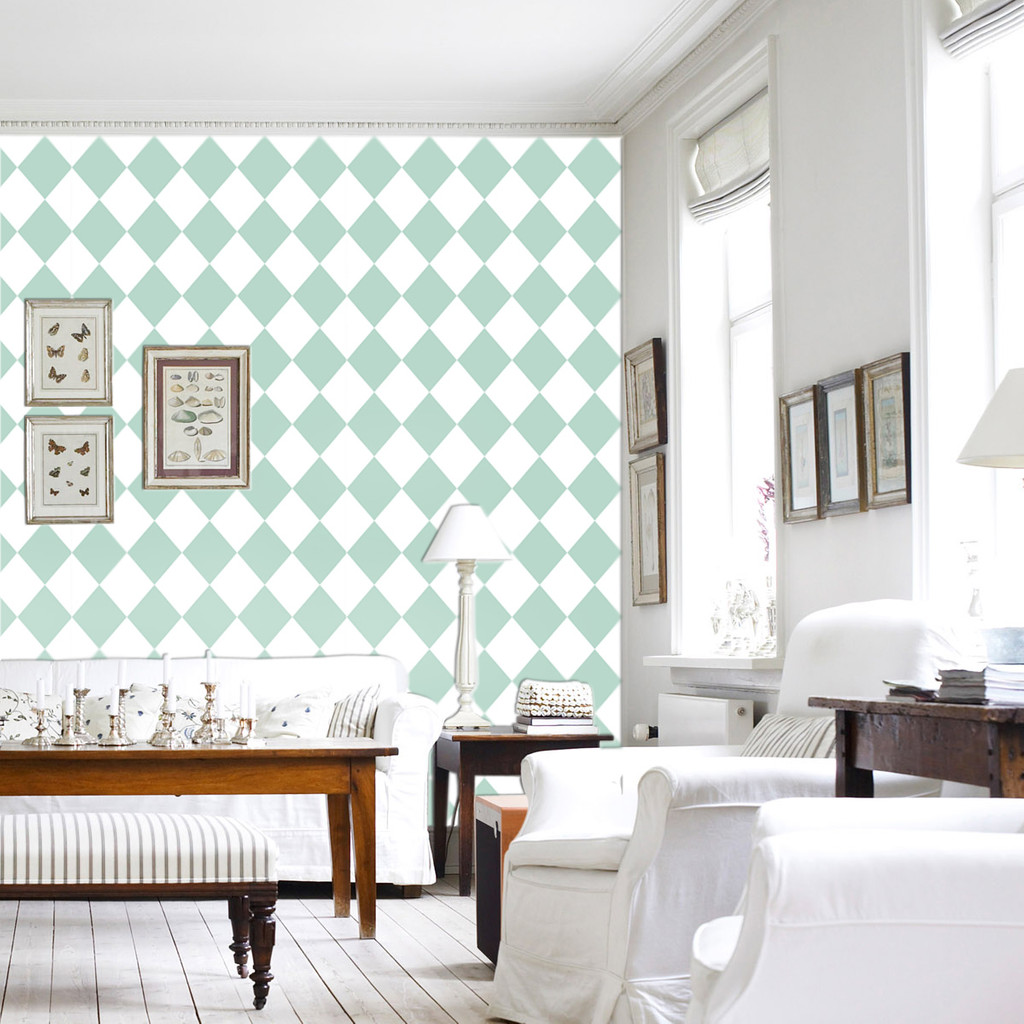 Tapeta na zeď s bílými a mátovými kosočtverci. Geometrický motiv ve velmi módní a populární mátové barvě.