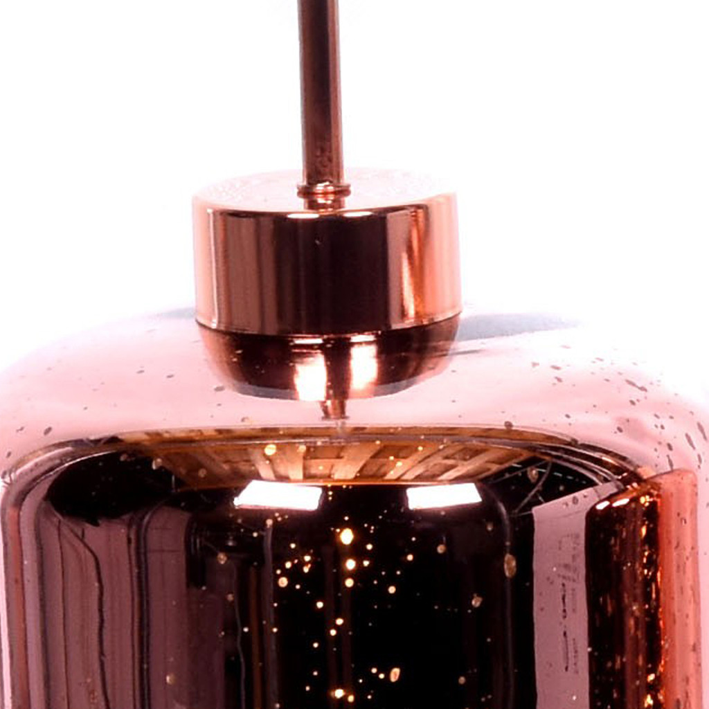 Trojitá závěsná lampa, moderní lustr ALACOSMO se třemi skleněnými stínítky v barvě rose gold (růžové zlato) a kovovou stropní krytkou, lištou. Světlo proniká otvory viditelnými na površích stínítek, díky čemu efekt pripomíná zářící hvězdy.