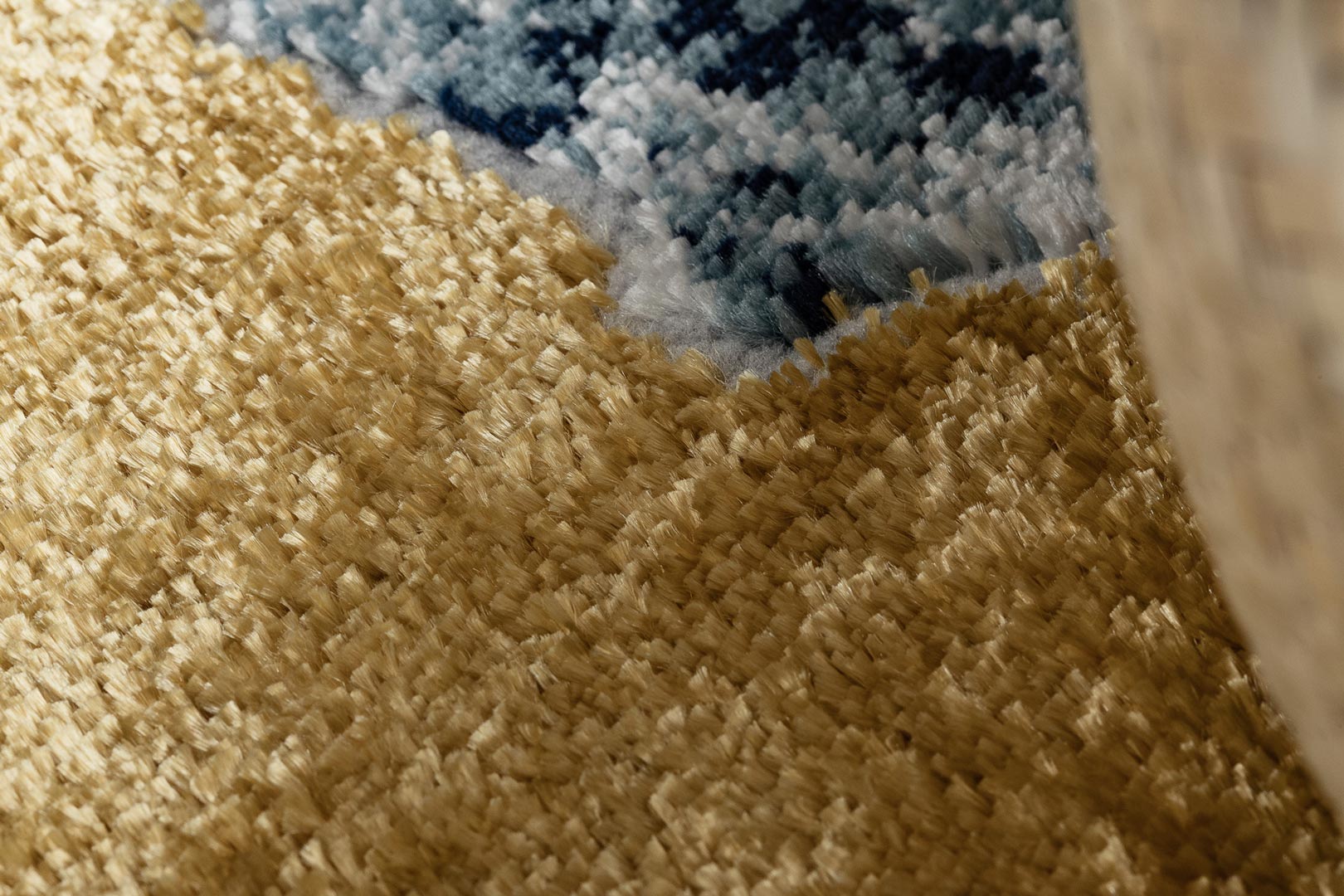 Umělecký glamour koberec, modrý, zlatý, žlutý, barevné tahy štětcem, moderní a vintage styl