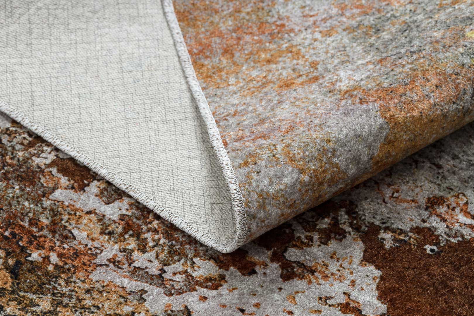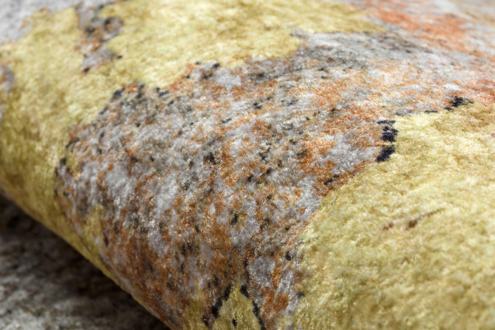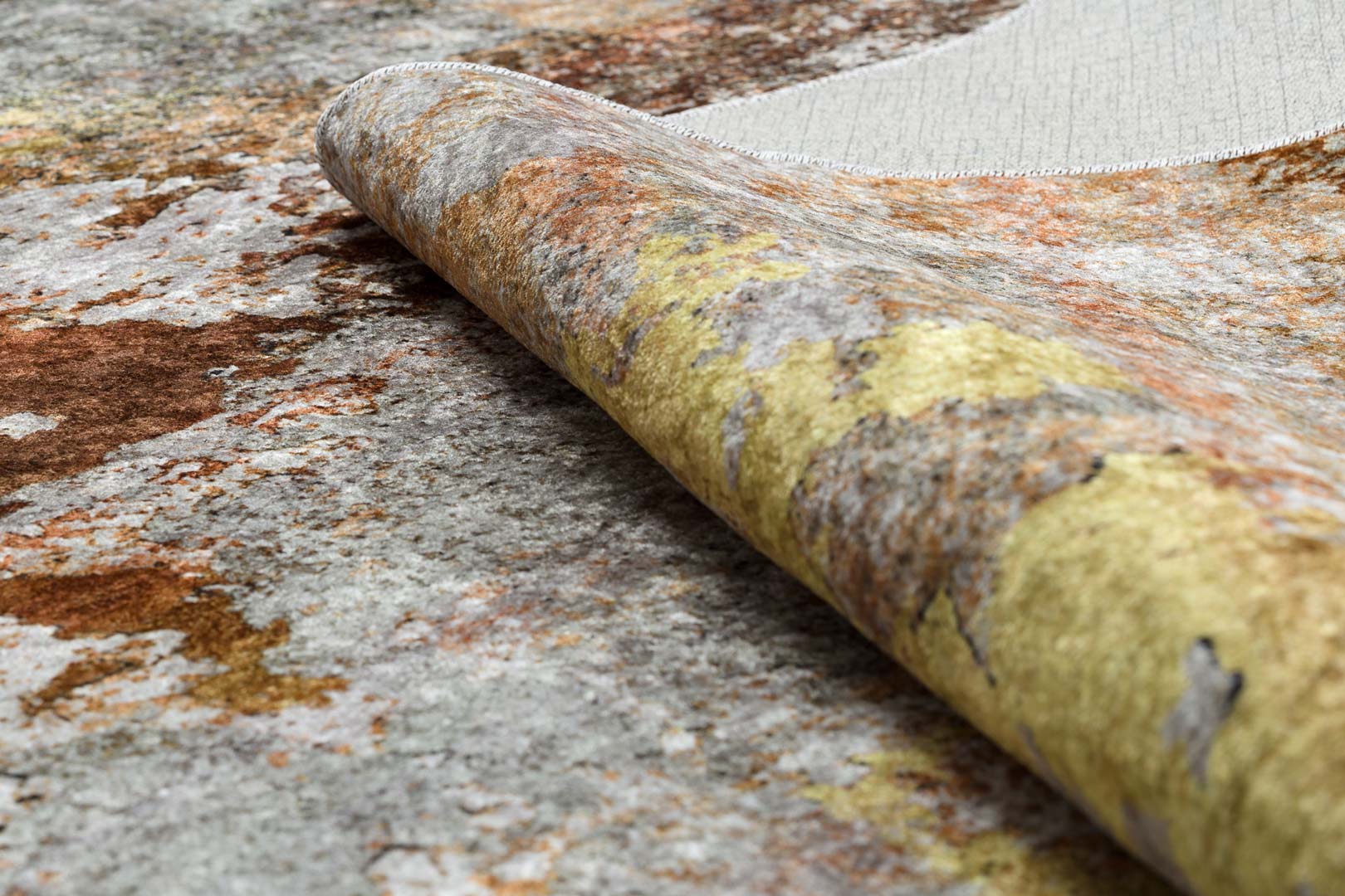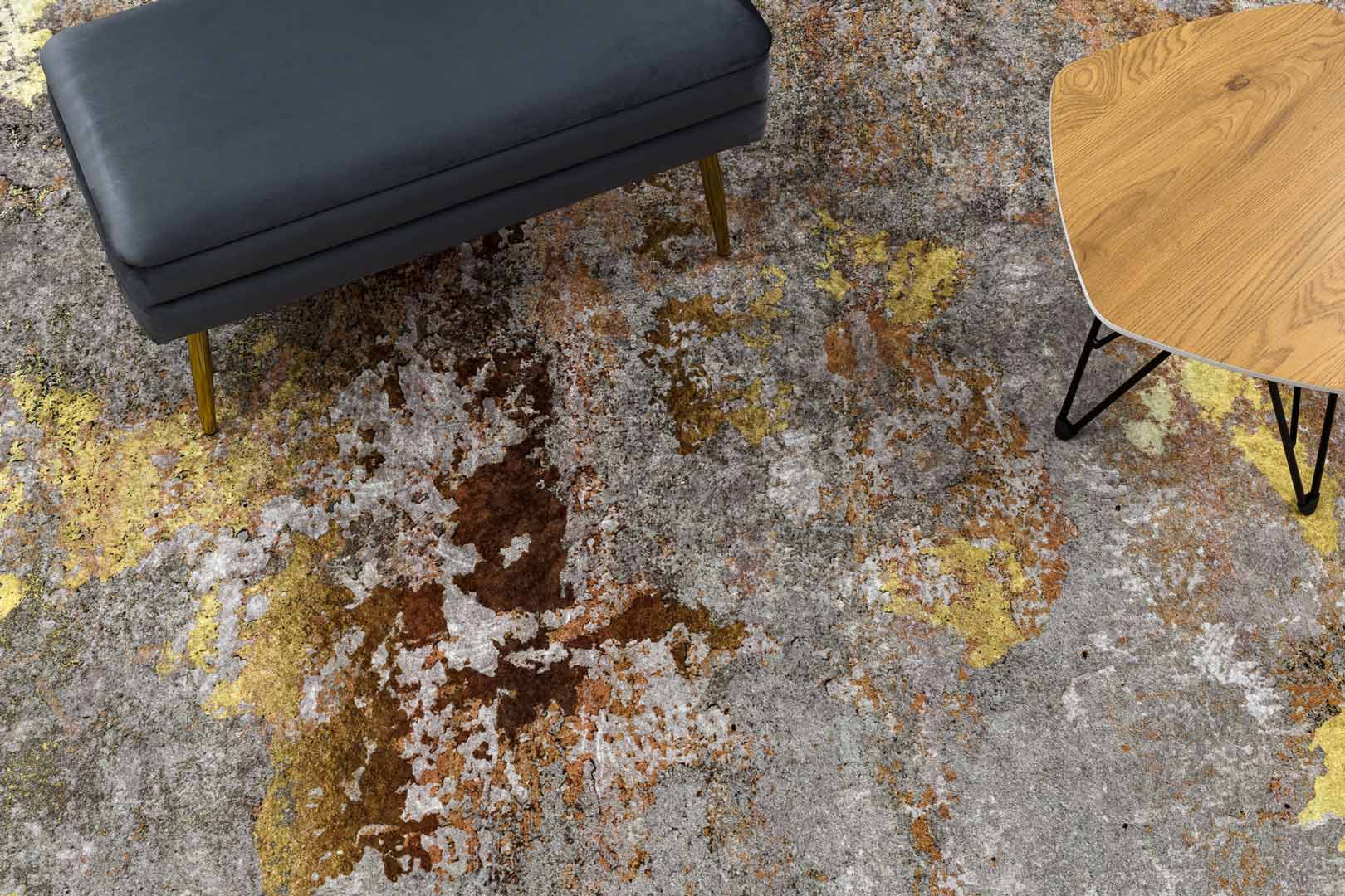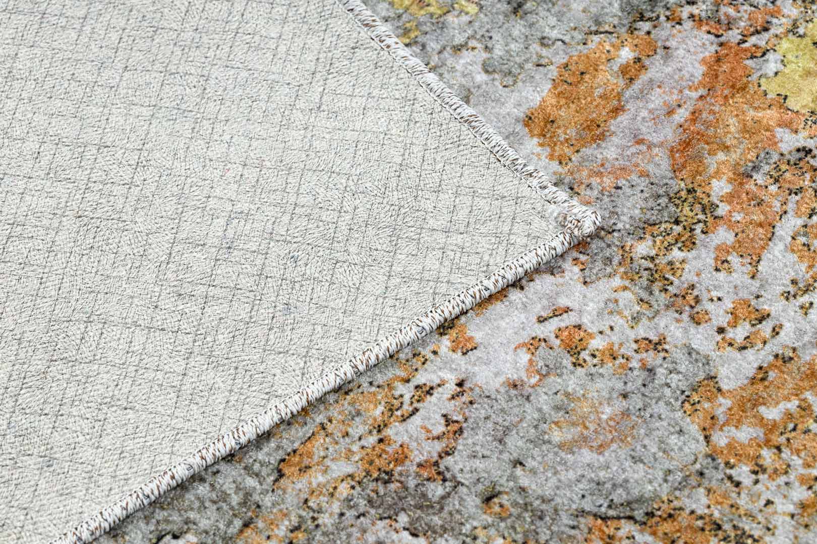 Žlutošedý koberec do obýváku nebo ložnice, zlatý, hnědý, měděný, abstraktní, protiskluzový, pratelný